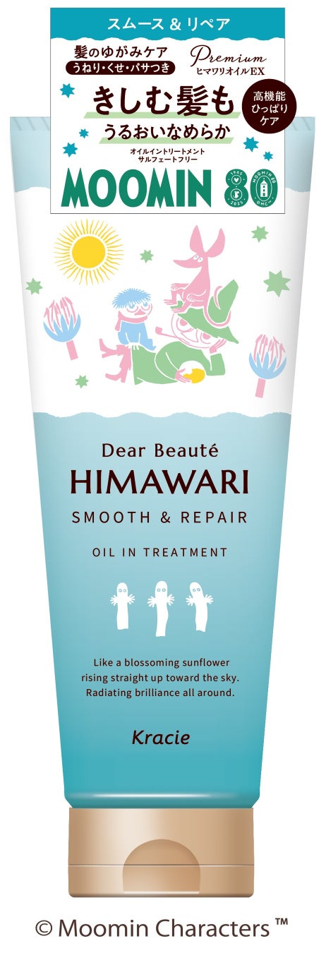 ブランド共通特長成分「プレミアムヒマワリオイルEX」配合で、髪ゆがみの原因を髪の内部と外側からトータルケアする「ディアボーテHIMAWARI」。「オイルイントリートメント」は、「高機能ひっぱりケア」を採用し、ブラッシングなど日常のひっぱりによって起きるゆがみをケアします。また、「湿気ケア」もできるので、湿度が高まる夏季に向け、デイリーケアに取り入れていただくのがおすすめです。髪悩みと仕上がりで選べる3ラインが「ムーミン」キャラクターで彩られ、思わず手にとりたくなるデザインで素直な髪を応援します。