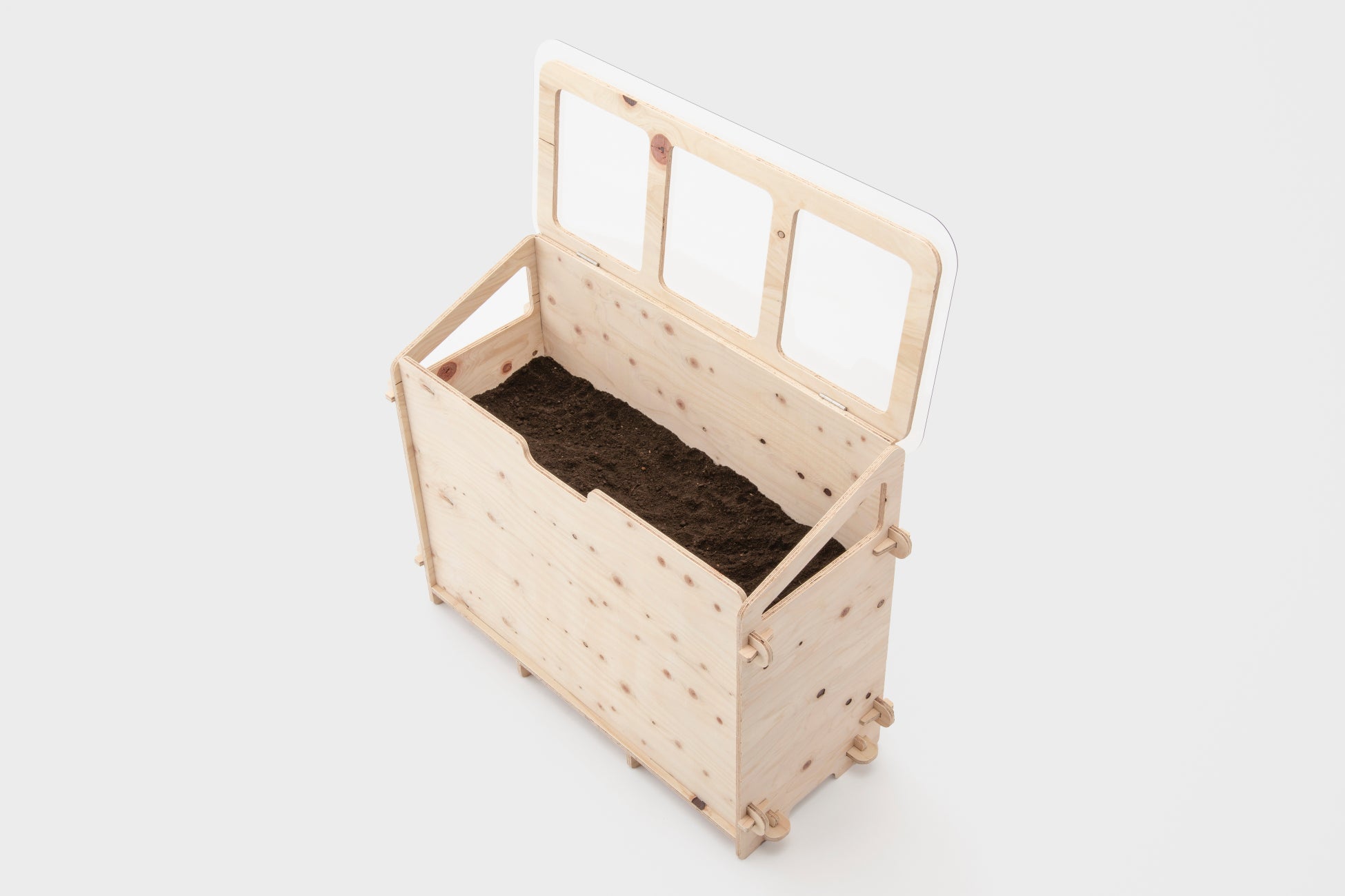 本商品は、黒土に含まれる微生物(バクテリア)の働きで生ごみを分解・消滅させる仕組みを採用し、電気・水・専用菌を必要としない点が特長です。黒土と容器があればすぐに使用でき、透明ふたと通気構造により、においや虫の発生を抑えやすい設計です。ベランダなど限られたスペースにも設置しやすいコンパクトな構造のため、集合住宅でも導入しやすく、DIY初心者でも簡単に組み立てることができます。さらに、組み立てたあと、自由に色をぬったり、やすりをかけて磨いたりと、自分好みに仕上げることができ、オンリーワンのキエーロづくりを楽しめます。