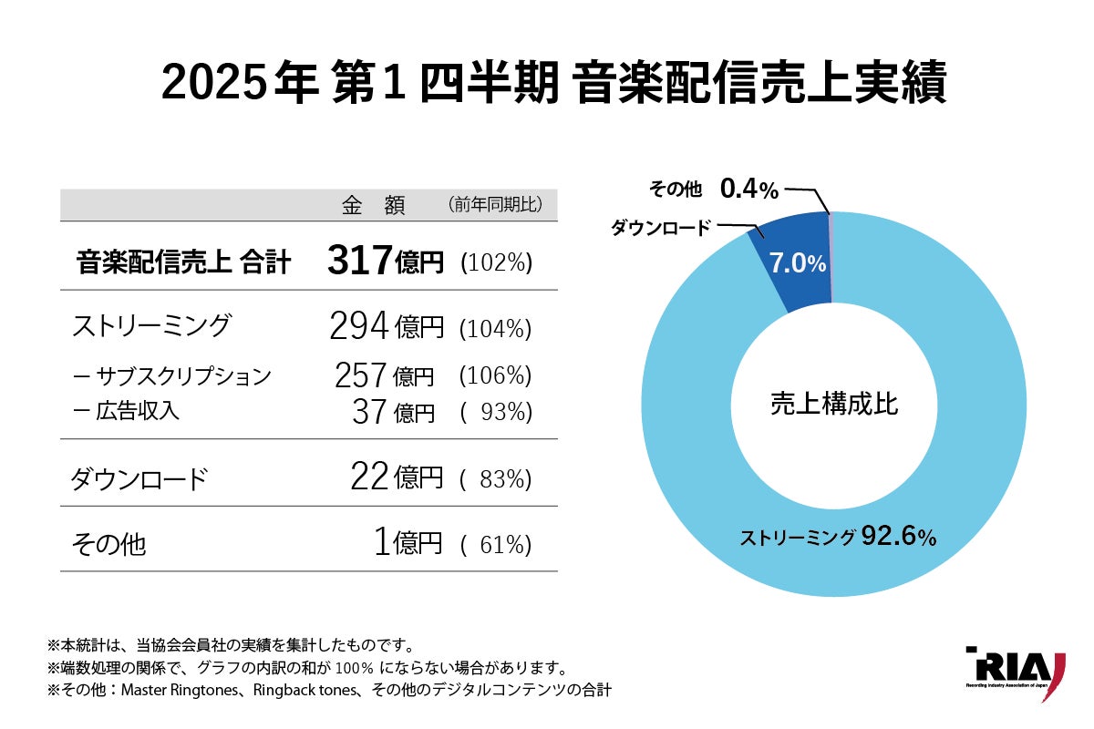 2025 年第1 四半期の音楽配信売上は前年同期比102%の317億3,600万円となりまし