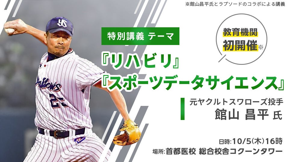 今回は、『怪我やリハビリ、トレーナーに求められるスキル』『館山昌平×ラプソードによる、スポーツ(野球)を科学する』の2本をテーマに、自身の経験をもとに、これから医療人、スポーツトレーナーを目指す学生たちに直接指導いただく貴重な機会となります。(館山昌平氏とラプソードのコラボによる講義は教育機関 初開催)