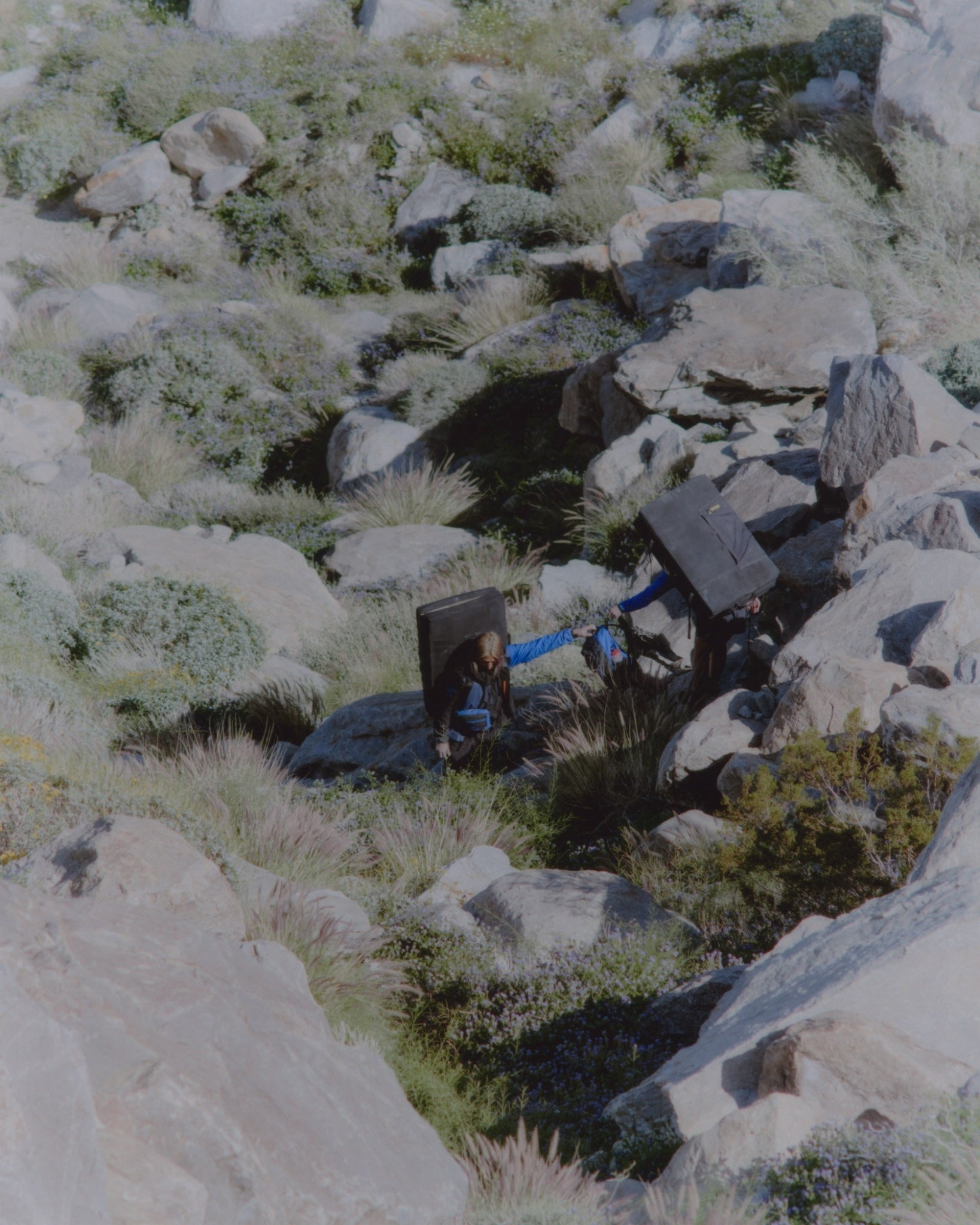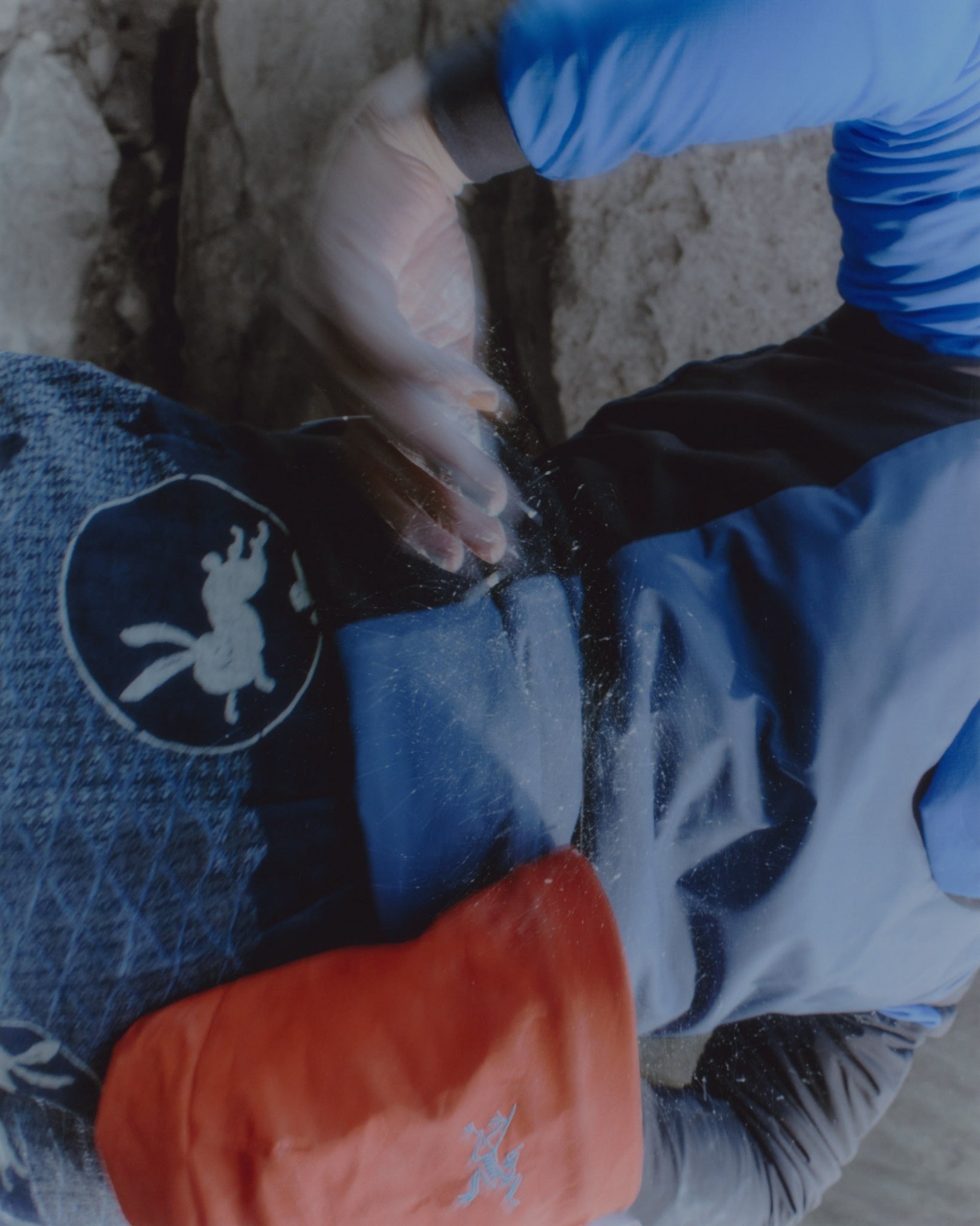 白石 阿島のアウトドアでのクライミングを、ドキュメントしたフォトを“Boro”のパッチワークのように仕立て、今回のコレクションの楽しさを伝えています。