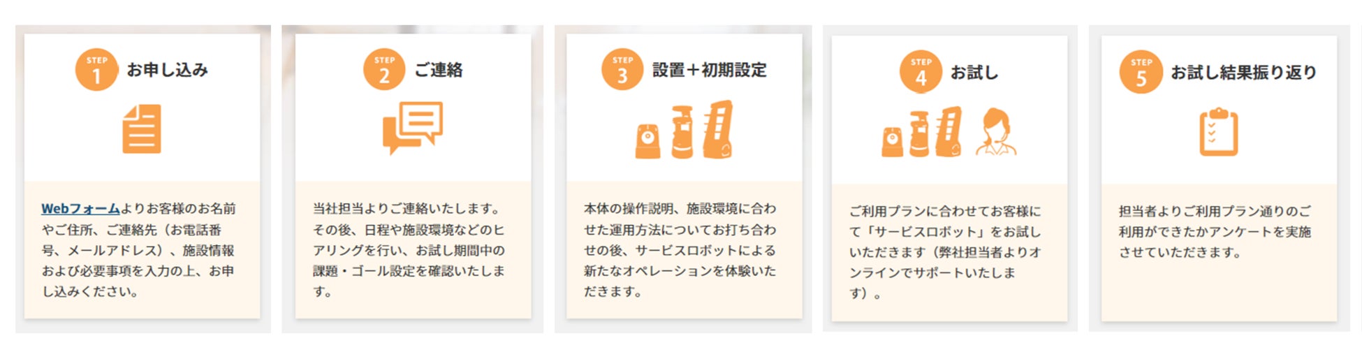 支援内容:対象ロボットの貸出し、利用環境の調査、設定や操作説明等のコンサルティング、お試し後の稼働レポート