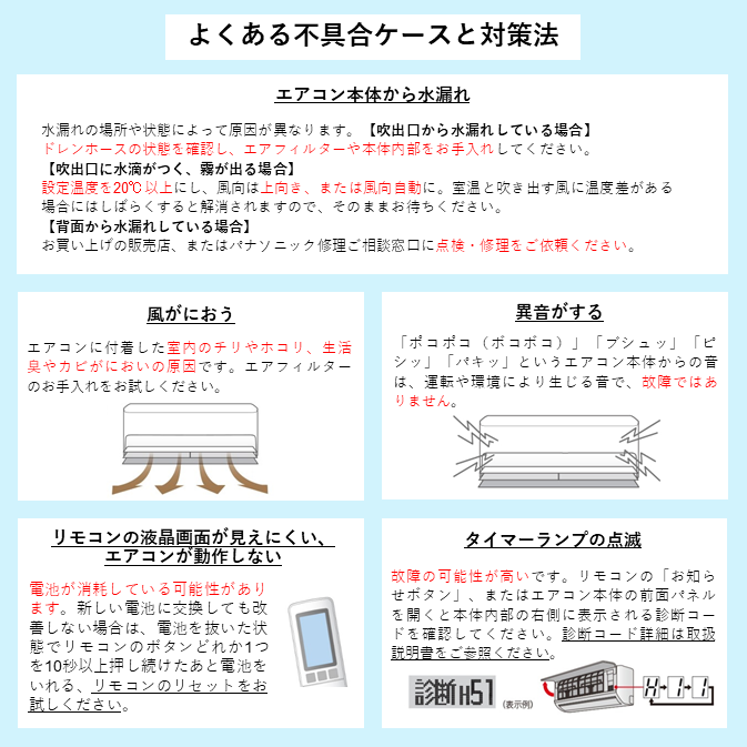 その他エアコン試運転時の不具合解決方法につきましてはパナソニックの下記公式サイトをご参照ください。