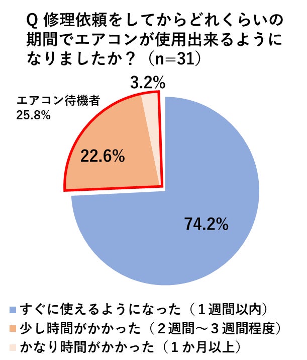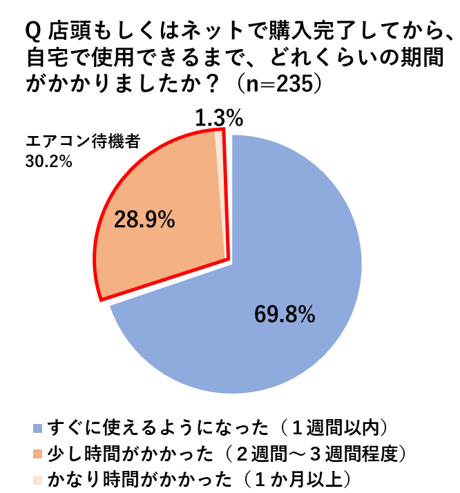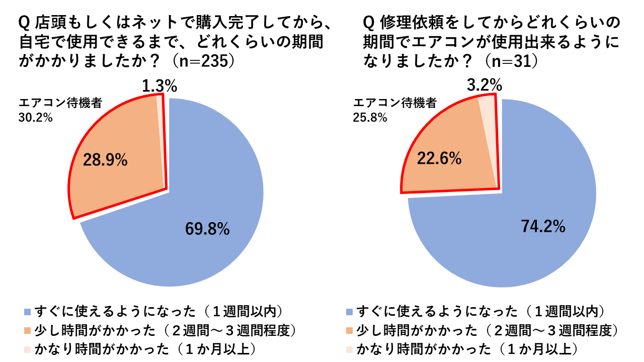 昨年エアコンを購入、または修理した人がエアコンを使用できるようになるまでの期間を調べたところ、夏時期(6~8月)のタイミングでエアコンを購入・修理した人、どちらも約3割(購入者:30.2%、修理者:25.8%)が発注から使用まで2週間以上待たされる『エアコン待機者』であることが明らかになりました。