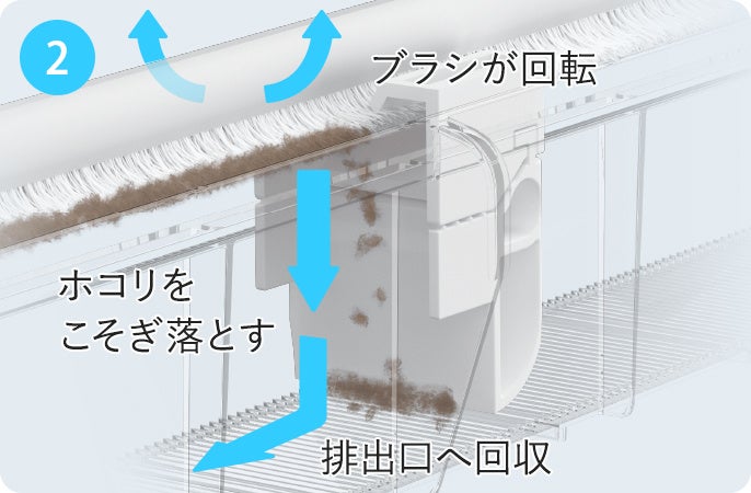 『エオリア』に搭載された“フィルターお掃除ロボット”は、累積24時間以上運転すると、自動で掃除を始めるという機能を持っています。フィルターが自ら動き、びっしりと配置されたブラシでクリーニングすることで、フィルターのホコリをしっかりとかき取り、キレイに取り除いてくれます。さらに、自動で捕集したホコリをブラシでかき取り、ダストボックスに入れ、配管穴から屋外へ自動で排出してくれる※1ため、ホコリに直接触れることなく、フィルター掃除を完了させることができます。