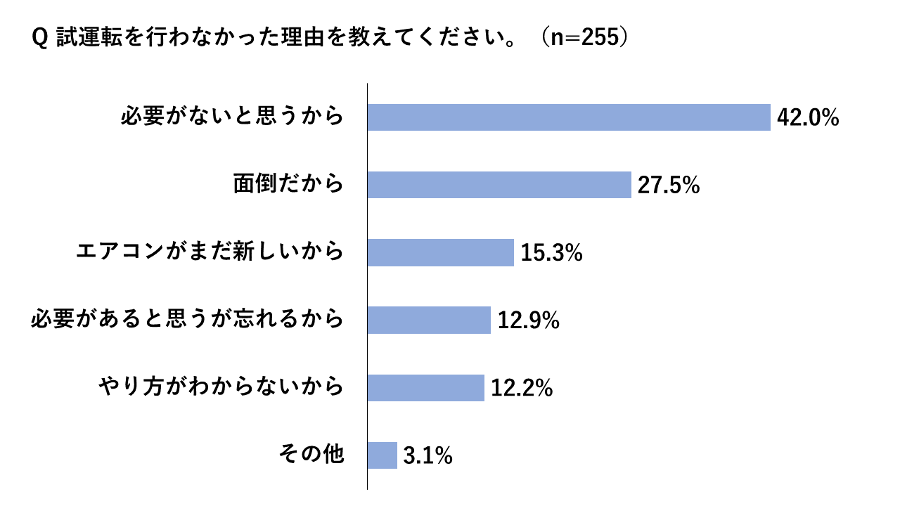 「2021年夏前にエアコン試運転を行いましたか」という質問では、53.6%が「行った」、46.4%が「行わなかった」という結果に。依然として半数近くの方がまだ試運転を行っていないことが明らかになりました。試運転を行わない理由としては、「必要がないと思うから」が最多で42.0%、続いて「面倒だから」が27.5%に。しかし、『エアコン待機者』とならないために、購入時期に関わらず早めの試運転は必要不可欠です。