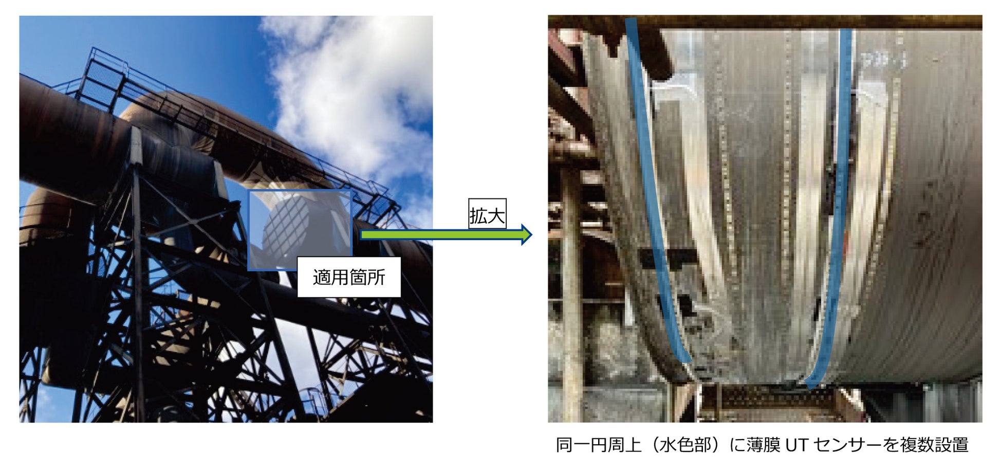 (注)UTは「Ultrasonic Testing:超音波探傷試験」の略。薄膜UTセンサーは一般的なUTセンサーと比べて薄くて柔軟性があり、高温となる環境下でも連続使用が可能です。