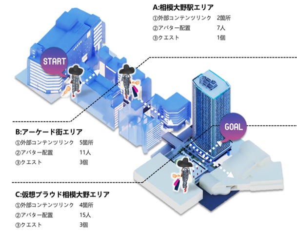 メタバース空間は、他地域からのアクセス面などの利便性について体感できる「相模大野駅エリア」、相模大野の街や生活の様子、プラウドタワー相模大野クロスの特徴を知ることができる「コリドー街エリア」、物件の専有部や共用部、実際の暮らしのストーリーを体感できる「仮想プラウドタワー相模大野クロスエリア」の3つのエリアをご用意しています。