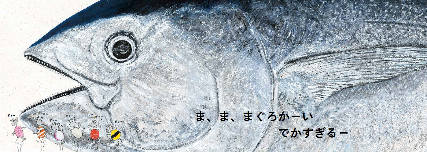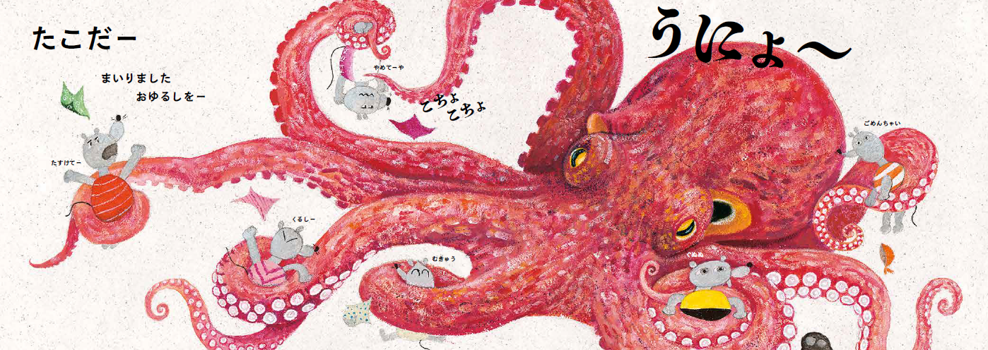 タコ、イカ、マグロなど絵本に登場する食材はどれもリアルで迫力満点。実際に築地市場や水族館に取材をしてモチーフの研究も行いました。