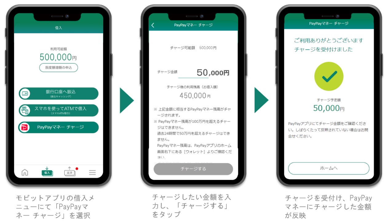 「PayPayマネー チャージ」とは、SMBCモビットでお借り入れしたお金を、手数料無料でPayPayマネーへ直接チャージができるサービスです。これにより、現金を介さずキャッシュレスでのお支払いが可能となり、お借り入れから決済までをよりシームレスにご利用いただけます。