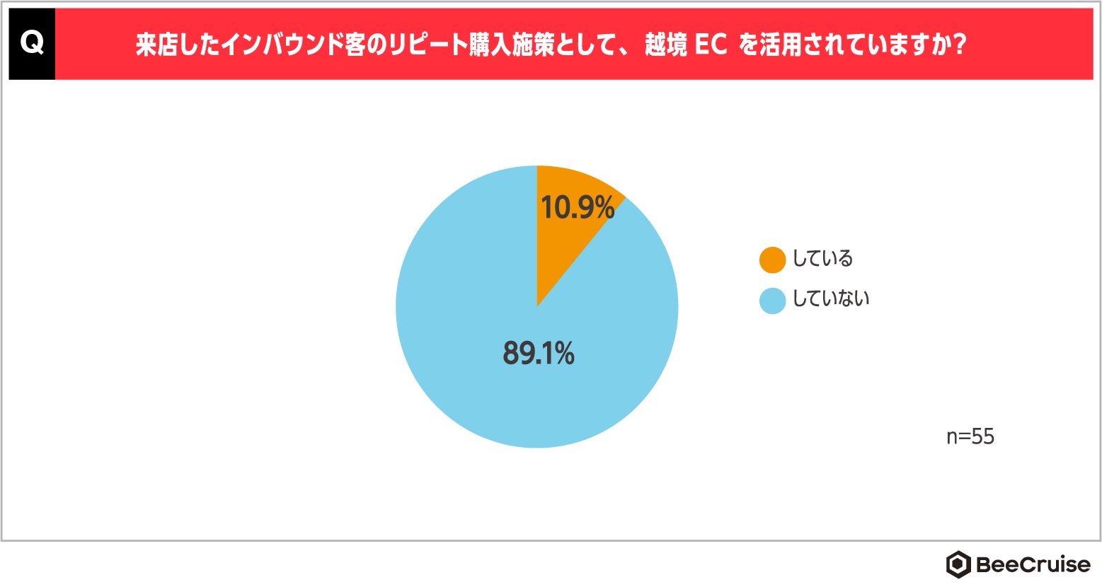 「来店したインバウンド客のリピート購入施策として、越境EC を活用されていますか?」(単一回答)では、「している」が10.9%、「していない」が89.1%となりました。越境ECの活用意向はあるものの、まだ導入は進んでいないことがわかりました。
