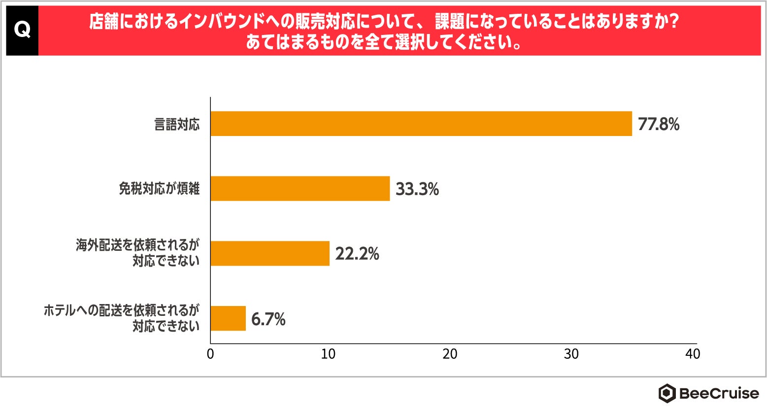 「店舗におけるインバウンドへの販売対応について、課題になっていることはありますか?あてはまるものを全て選択してください」(複数回答)では、「言語対応」が77.8%、「免税対応が煩雑」が33.3%、「海外配送を依頼されるが対応できない」が22.2%、「ホテルへの配送を依頼されるが対応できない」が6.7%となりました。インバウンドの戻りを感じているものの、店舗対応の側面では「言語対応」に課題が大きいことがわかります。また、「免税対応」や「海外配送」など運営方法にも課題を感じていることがわかります。
