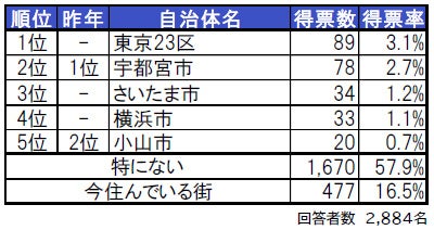 昨年は栃木県内の自治体のみを対象として集計していましたが、今年は全国の自治体を対象とした結果、上位5自治体のうち3自治体(東京23区、さいたま市、横浜市)が県外の街という結果となっています。