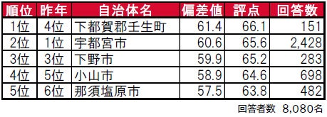 •昨年は栃木県内のみを対象として集計しているため、県外の自治体の昨年順位は「-」となっています。