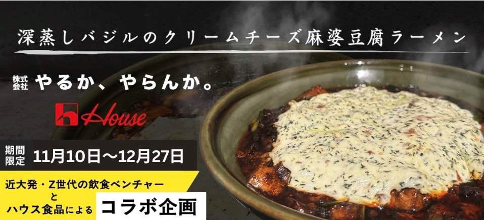 ハウス食品株式会社(本社:東京都千代田区、代表取締役社長:川崎浩太郎)と、近畿大学発ベンチャーである株式会社やるかやらんか(本社:奈良県橿原市、代表取締役社長:西奈槻)は、ハウス食品が開発したオリジナル素材「深蒸しバジル」を使用した限定コラボラーメンを、令和7年(2025年)11月10日から12月27日まで、すするか、すすらんか。心斎橋店にて期間限定販売を実施いたします。本商品は、ハウス食品が「旨みぎゅっと深蒸し製法」(特許第7616828号)を用い独自開発した「深蒸しバジル」を素材提供し、すするか、すすらんか。が自家製の麻婆豆腐ラーメンに合わせ、香りをより一層引き出すためのクリームチーズをトッピングして仕上げた絶品の一杯です。
