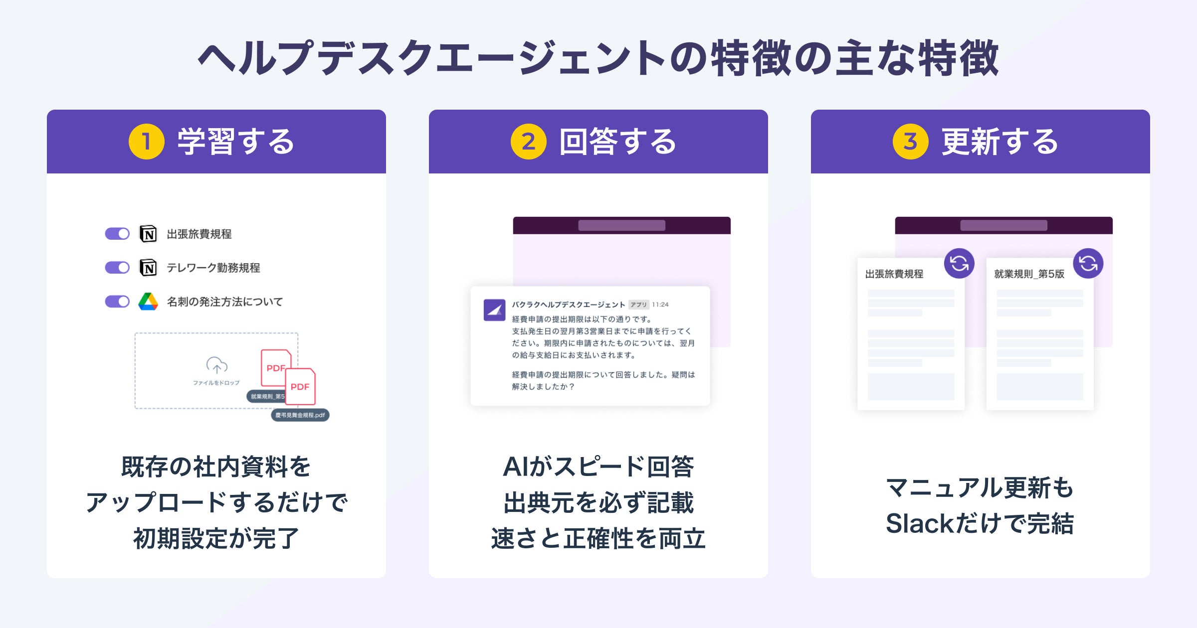 「バクラクヘルプデスク エージェント」は、社内規程や業務マニュアルをアップロードするだけで、多様な質問にAIが自動で回答します。利用はSlack上で完結するため、最低限の初期設定で運用を開始できます。今後、対応プラットフォームの拡大も予定しています。
