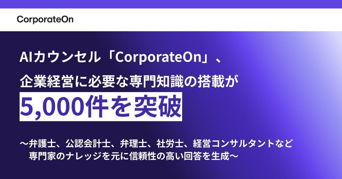 株式会社LegalOn Technologies(本社:東京都渋谷区、代表取締役 執行役員・CEO:角田 望)が提供する、AIカウンセル「CorporateOn」(https://lp.www.legalon-cloud.com/corporateon)に搭載された企業経営に必要な専門知識(コーポレートナレッジグラフ)が5,000件を突破しました。弁護士や公認会計士、税理士、弁理士、社会保険労務士、経営コンサルタントなど、さまざまな専門家が保有する知識を「CorporateOn」上に搭載したことで、信頼性の高い一次情報を元に事業推進における必要な回答を得ることが可能になります。