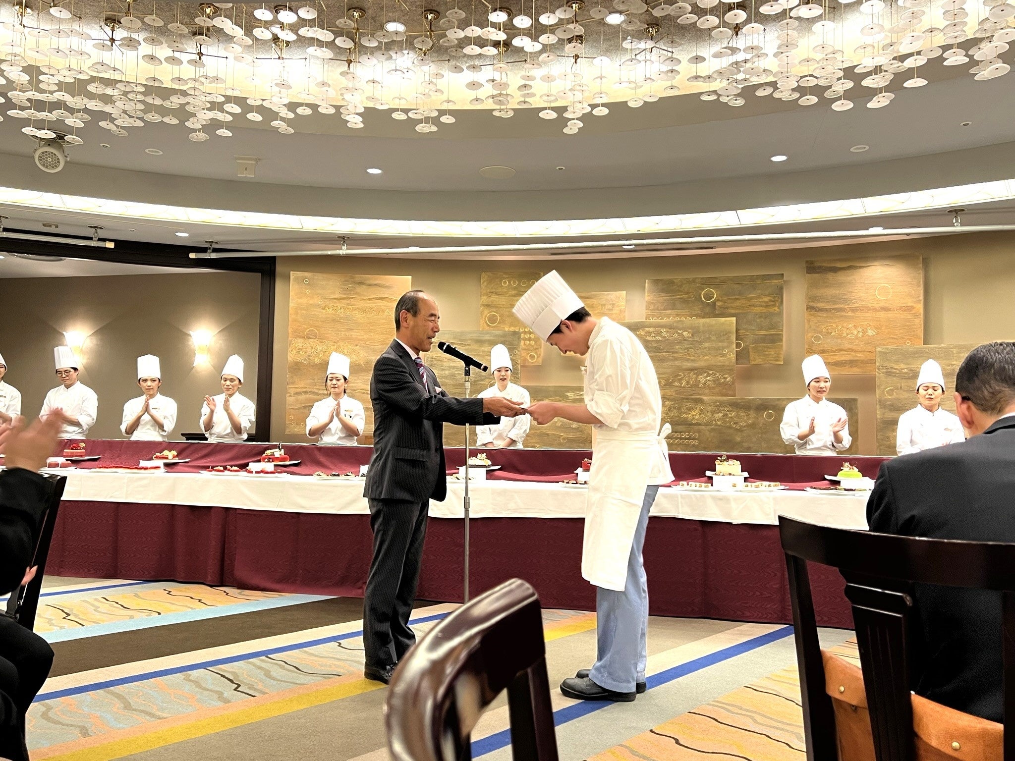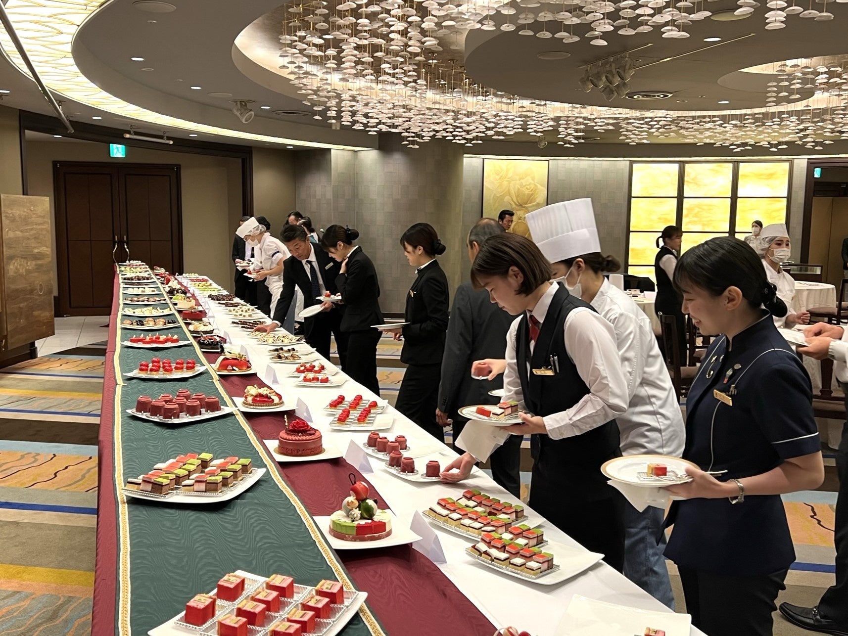 毎年7月に、今年度の新作クリスマスケーキ商品を決定する社内コンテストを実施しております。当ホテルのパティシエが試行錯誤を繰り返し先輩スタッフなどにアドバイスを求めながら、考案した渾身の作品を出品します。幹部社員をはじめ各部署を代表するスタッフ、外部審査員を招聘し、デザイン・味わい・テーマ性などの観点から総合評価で入賞作品を決定しております。