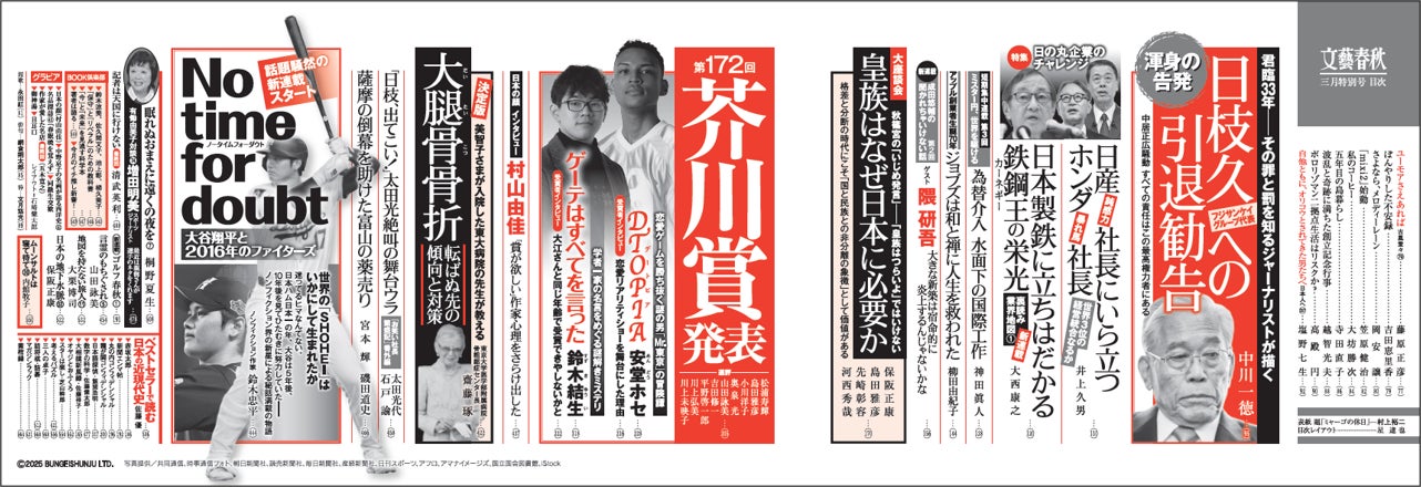 『文藝春秋』三月特別号本日発売!第172回芥川賞「DTOPIA」安堂ホセ/「ゲーテはすべてを言った」鈴木結生、新連載「No time for doubt 大谷翔平と2016年のファイターズ」が掲載!