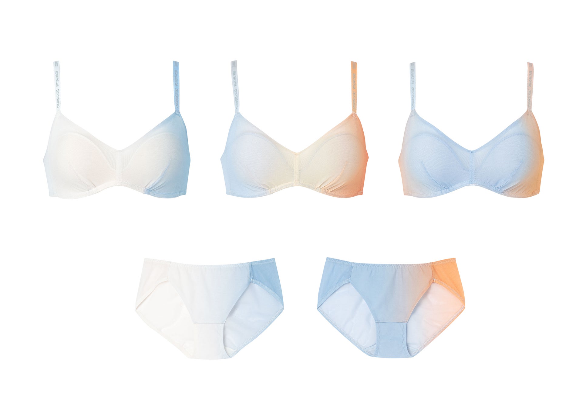 太陽が昇る朝の「赤色」から、雲から最も高く昇った陽が差し込む昼どきの「青色と白色」、そして夕焼けに移り変わっていく「青色から赤色」といった一瞬を切り取り、グラデーションで表現しています。商品ラインナップはブラ3色、ショーツ2色。どの色も素敵に組み合わせられる仕様です。