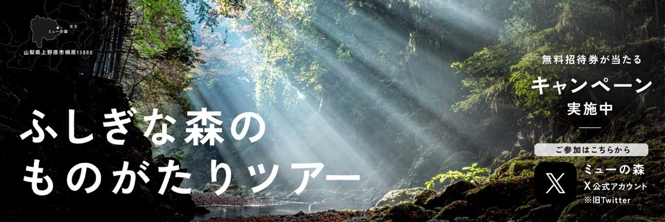 ミューの森X公式アカウント(@mieux_forest)をフォローし、該当ポストに「いいね」していただくと、抽選で合計5組(1組につき大人2名子ども3名まで、合計最大25名さま宿泊分)に『ふしぎな森の、ものがたりツアー』キャンペーン 無料招待券をプレゼントいたします。