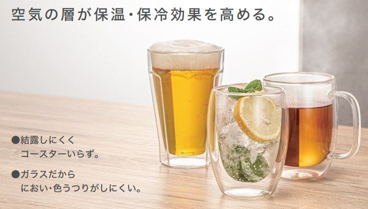 ガラスの2層構造により空気の層ができ、外部の温度変化が飲み物に影響しにくいので、結露も生じにくくなっています。耐熱ガラスを使用しているので、熱い飲み物にも冷たい飲み物にも使用でいただけます。さらに、ガラスはにおいや色移りがしにくいため、コーヒーやジュースなど様々な飲み物を楽しむことができます。