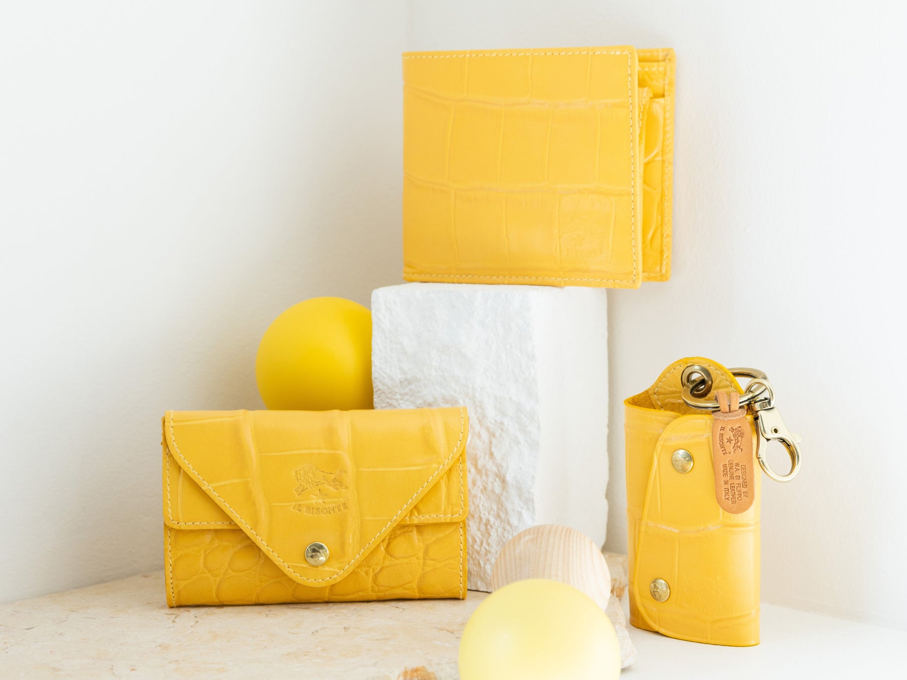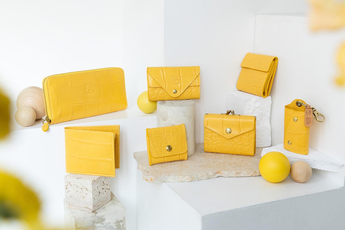 洗練された印象がひときわ際立つクロコ エンボスドレザーに、ポジティブムード溢れるイエローカラーを効かせたコレクション。余分をそぎ落としたミニマルなウォレットや、エンベロープ型のフロントデザインが愛らしいカードケース、収納力を誇るキーケースなどを加え、全7型を展開。
