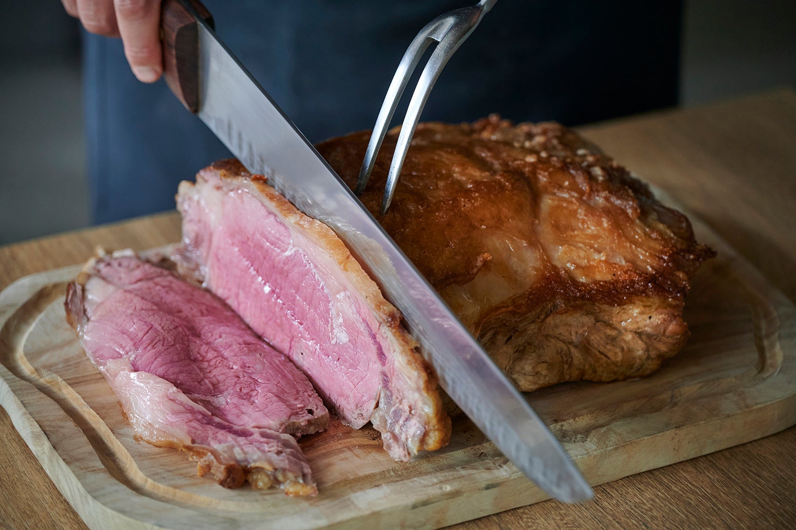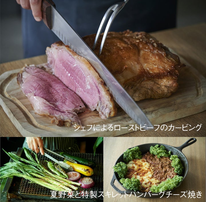 夏ブッフェのメインは鴨・牛・鶏・豚に羊をプラスした5種類のお肉を使ったさまざまなお料理が並びます。メインの一つでもある“ローストビーフ”はシェフが目の前で手切りでサービス。またポテルスタッフによる生ハムのカービングなどもお楽しみいただけます。さらに旬の夏野菜をじっくりと焼き上げた焼き野菜やフライをはじめ、特製のスキレットハンバーグチーズ焼きのほか、仔羊のタコス・骨付き鶏ドラムのフライドチキン・2種のカレーなど、暑い夏でも食欲をそそる料理をラインナップ。