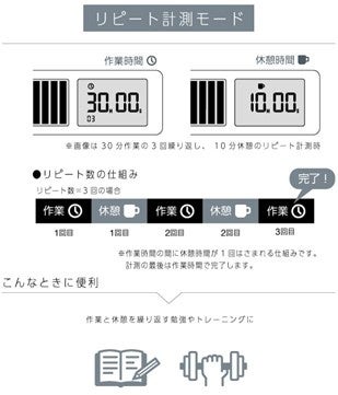 時間のカウントダウンとカウントアップができる「通常計測モード」に加えて、作業時間と休憩時間のカウントダウンを指定回数交互に繰り返す「リピート計測モード」が選択可能です。「リピート計測モード」は、勉強や運動の時間管理や「ポモドーロ・テクニック※」などの集中メソッドにも活用できます。