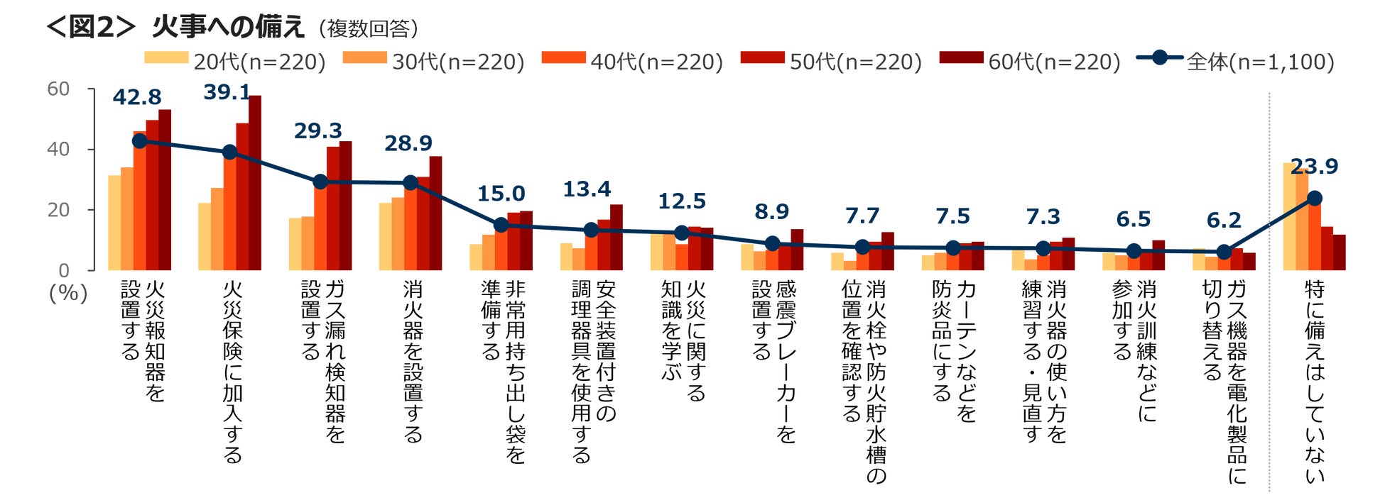 「特に備えはしていない」は、20代・30代で3割を超える。<図2>