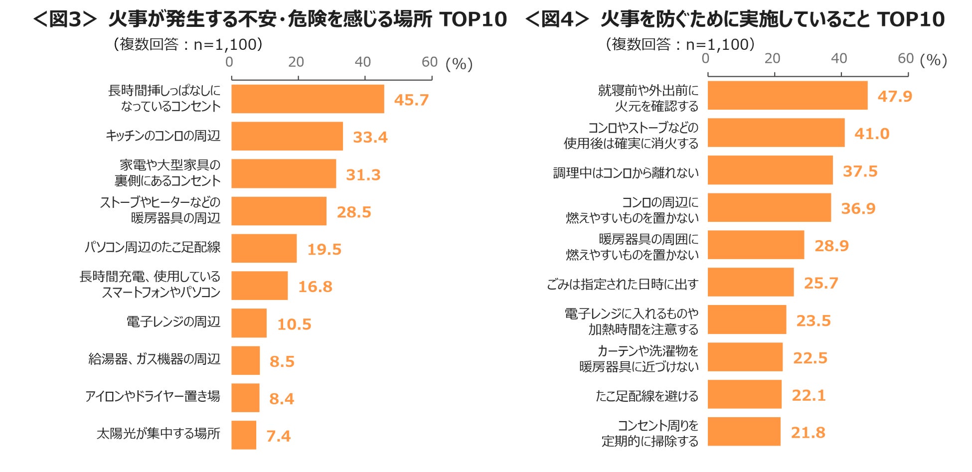 火事が発生する不安・危険を感じる場所は、「長時間挿しっぱなしになっているコンセント」が45.7%で最も多く、「キッチンのコンロの周辺」「大型家電の裏側にあるコンセント」「暖房器具の周辺」が続く。<図3>