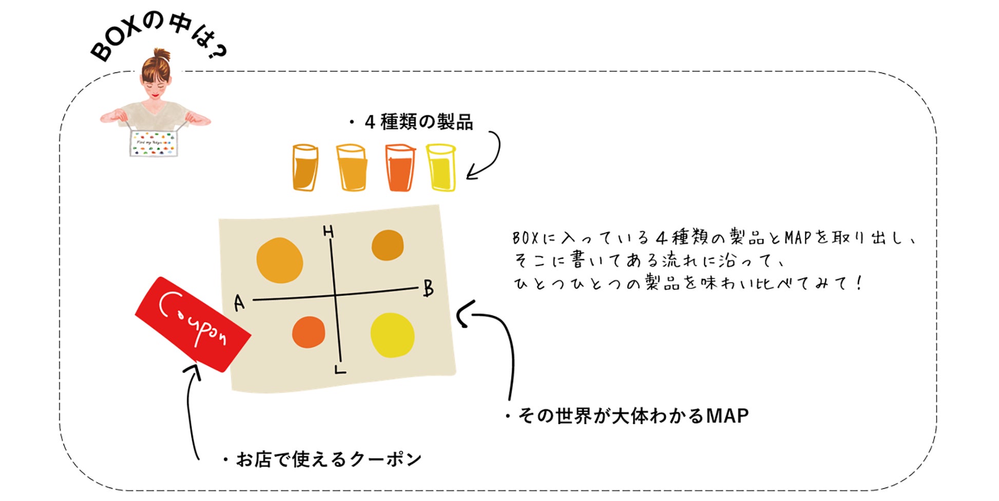 『東京○○入門BOX』は、○○にあたる商品カテゴリーごとに、特徴の異なる4種類の商品と、味や特徴について説明が書かれた「MAP」が同梱されています。「MAP」は商品カテゴリーごとの特徴となる4象限に分けて解説されており、お店の方が語る商品の魅力や、産地・製法・種類による違いなど、その商品にまつわるコラムも記載されています。それらを見ながら商品を体験することで、理解が深められる設計です。
