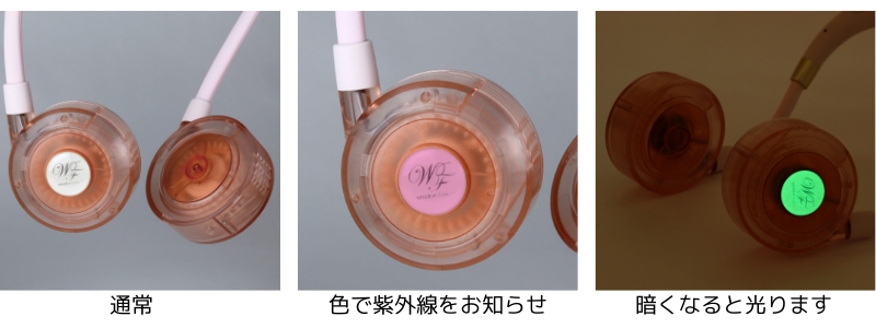 ファンの中心にUVチェッカーシールが付いているので、紫外線が当たるとピンク色になります。また、暗くなると蓄光効果でシールが光ります。