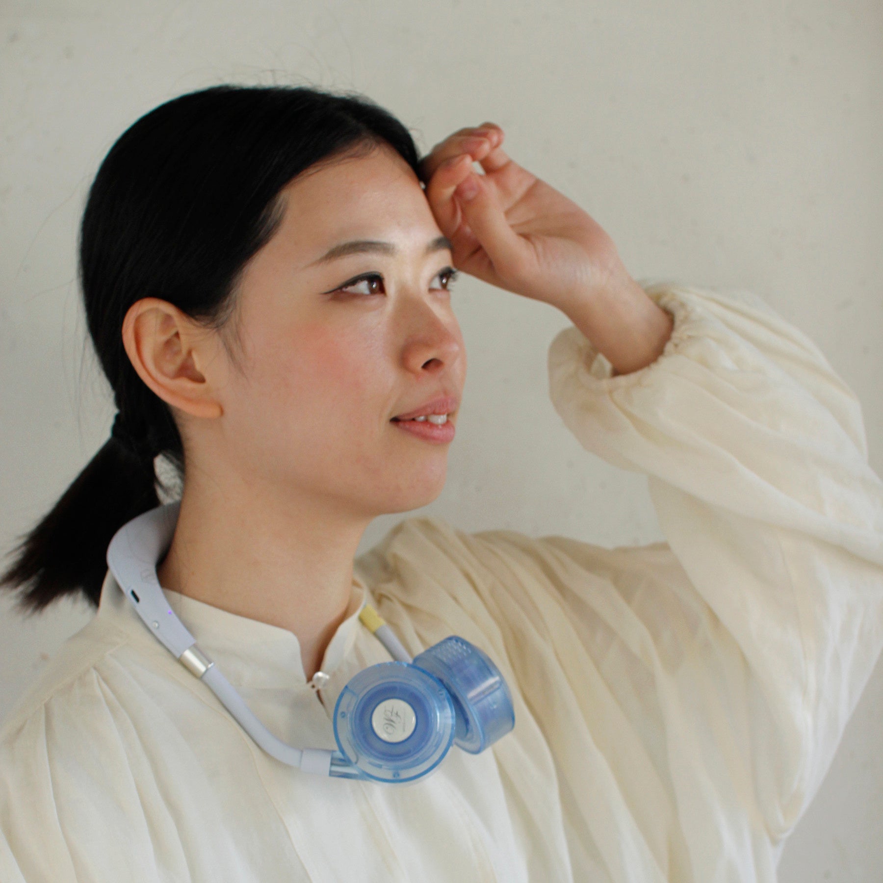 扇風機を首から下げる形状で装着して使用できるようにすることで、 両手が自由な状態で顔や胸などが涼しくすることができるネックバンド型扇風機。扇風機部分につながるアームは自由に方向、角度が調節可能。