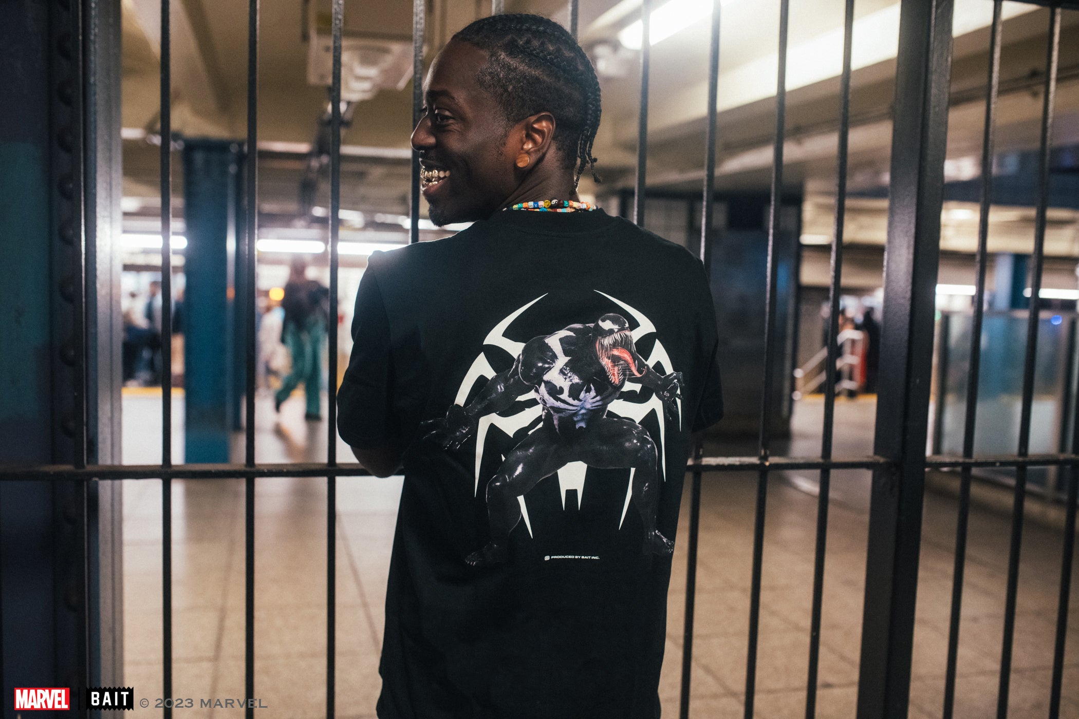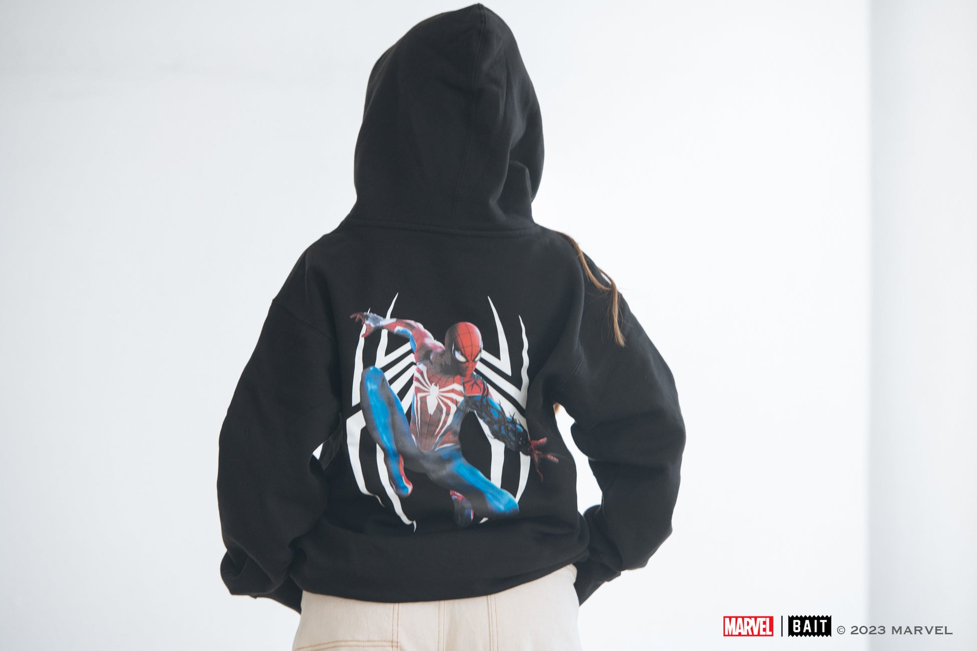 今回、BAITとのカプセルコレクションではゲーム内に登場するピーター・パーカーとマイルズ・モラレスの二人のスパイダーマンに加え、最強のヴィランであるヴェノムがバックプリントにデザインされたTシャツとフーディが揃う。