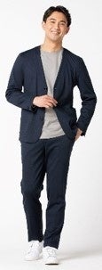 ポンチジャージ素材では初のノーカラージャケットをご用意。「リラックス感」を出しつつも、3つボタンにすることで「きちんと感」は残し、ビジネスシーンでもプライベートでもお召いただけるデザインです。