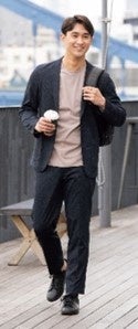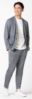 今回の軽量ポンチジャージー素材パジャマスーツ®は昨年の秋冬モデルに比べ、約20%軽量化しておりカーディガンのように羽織ることができます。生地は薄手でありながら、ポンチジャージー素材ならではのハリ・コシ感があり、ラインを拾いすぎないため「きちんと感」を演出できます。また、高いストレッチ性も兼ね備え、パジャマスーツ®らしい「リラックス感」もあるため、ONでもOFFでもお召いただけます。