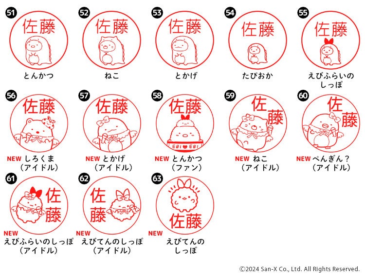 今回は8月に登場したすみっコぐらしの新テーマ「天使なえびてんアイドル」より、そんな「えびてんのしっぽ」を含む8種類(以下「NEW」マークがついている、56番から63番までのイラスト)が新イラストとして登場。どれにしようか迷ってしまうほどかわいい合計63種類より、お好みのコのイラストが選べるようになりました。