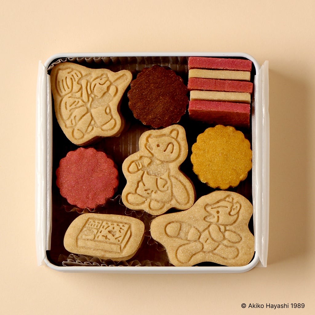 今回コラボレーションするクッキー缶では、絵本に登場する、ふたりが食べた”あげどん弁当”やこんとあきをクッキーで再現しています。クッキーは全33枚ぎっしりと詰まっています。