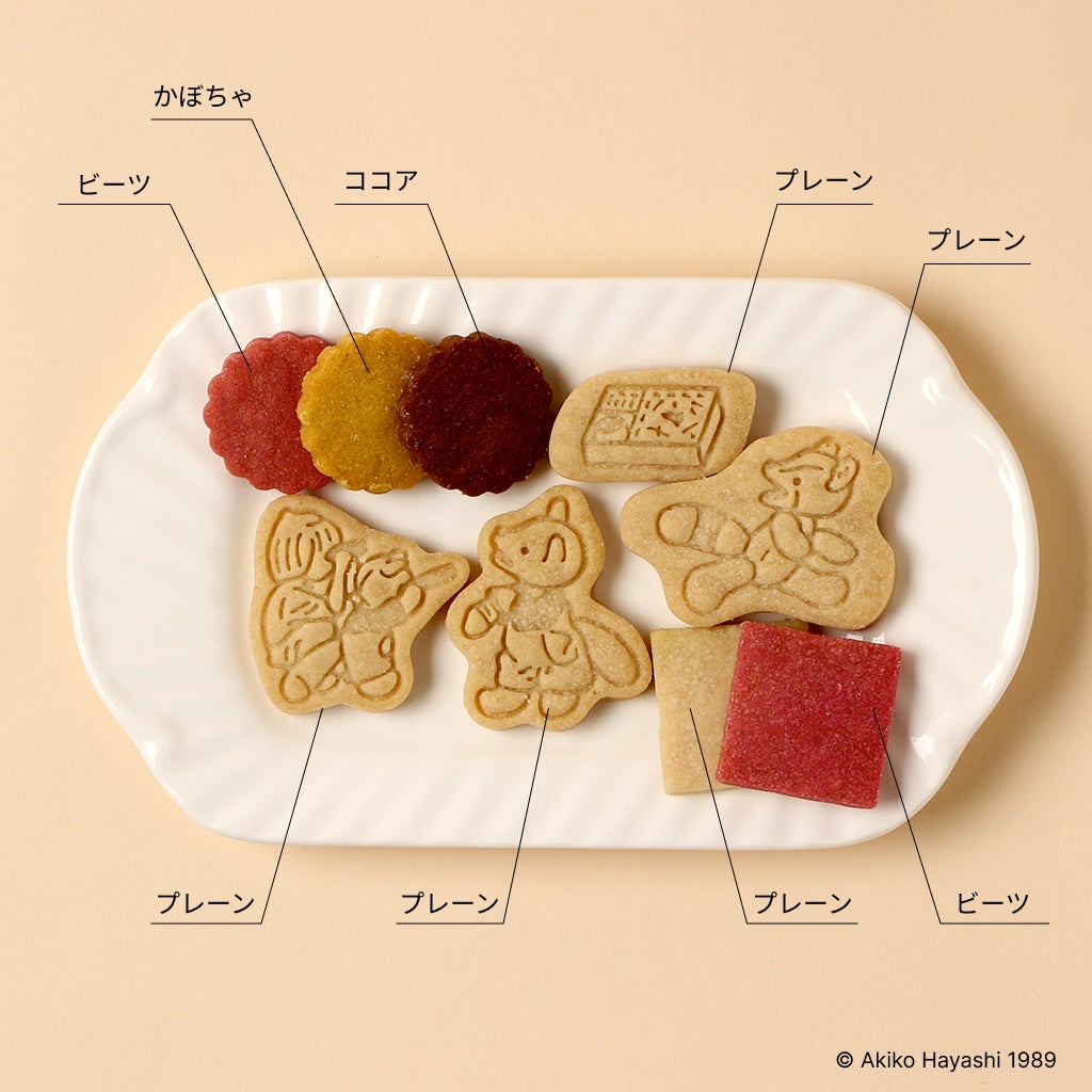 中に入っているクッキーは「お子さまもご家族もいっしょに美味しく召し上がってほしい」という想いから、原材料にもこだわり、「小麦・卵・乳」不使用です。白砂糖も不使用で、きび砂糖と玄米粉を使用した優しいお味に仕上げました。小さなお子さまに寄り添った商品を目指し、保存料、香料、着色料も使用しておりません。「かぼちゃ」「ビーツ」味のクッキーは、野菜パウダーを使用していますが、野菜が苦手なお子さまも食べやすい味にしています。