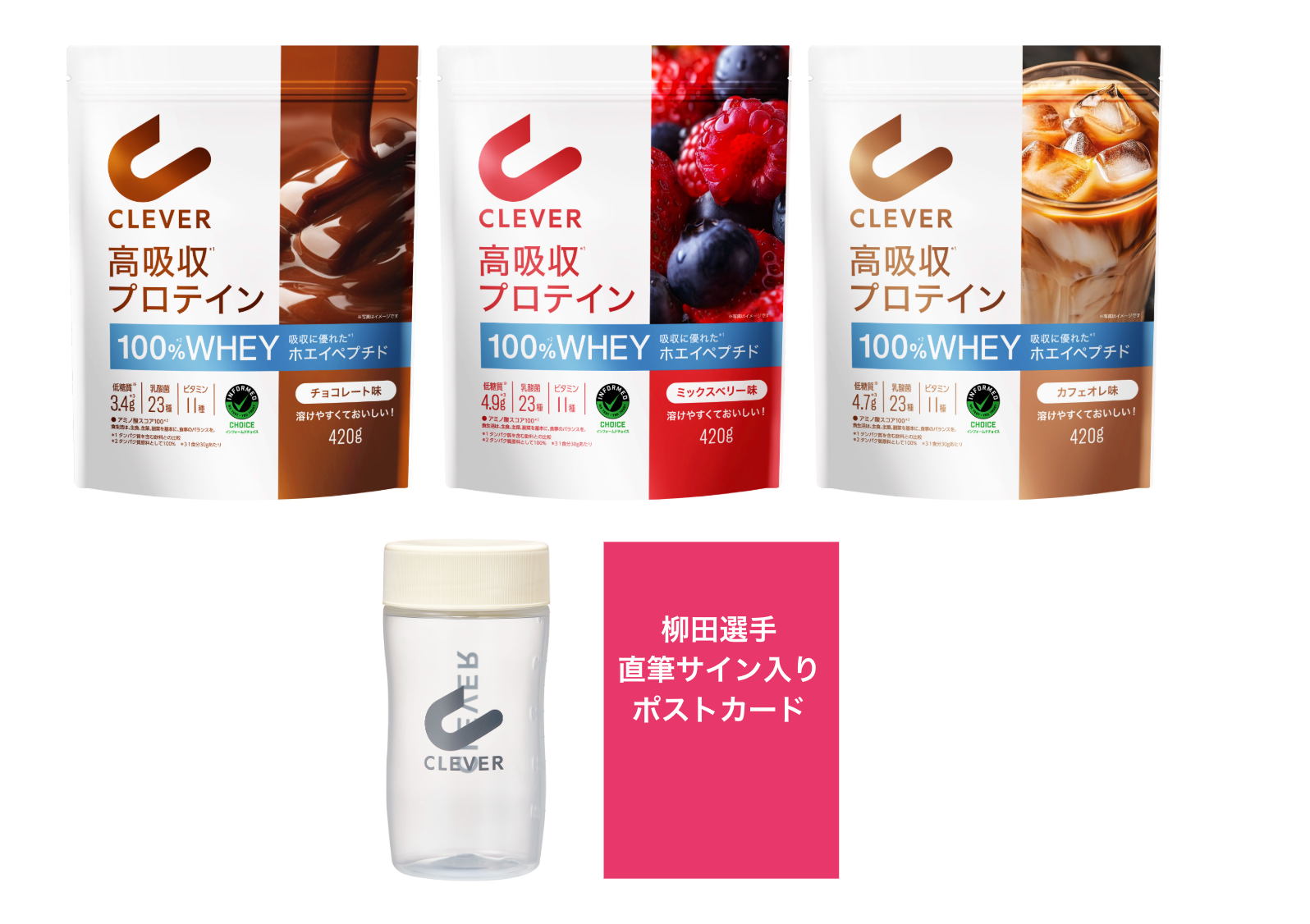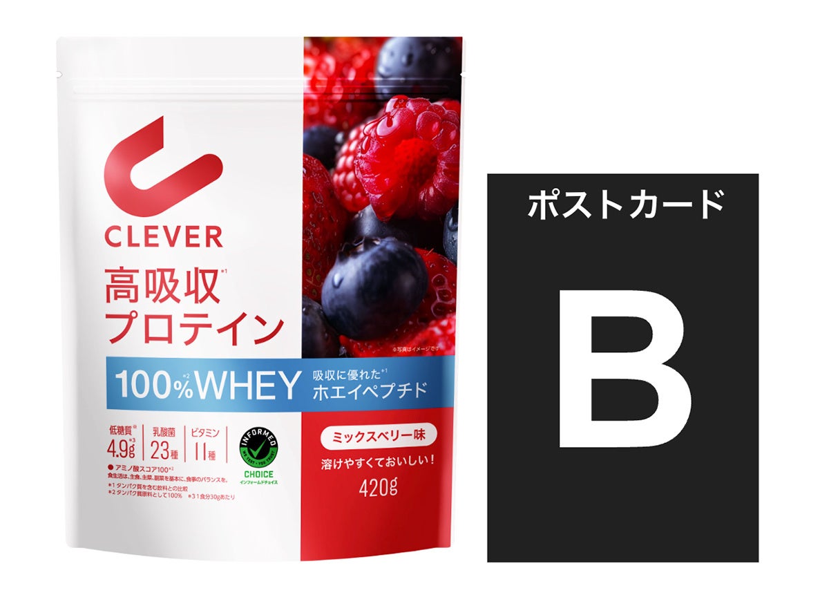 さらに、ブースにて『クレバー高吸収プロテイン』をご購入いただいた方には、数量限定で柳田選手のポストカード(全4種)をプレゼント。柳田選手とともに届けるクレバーの新商品を、ぜひ会場でご体験ください。