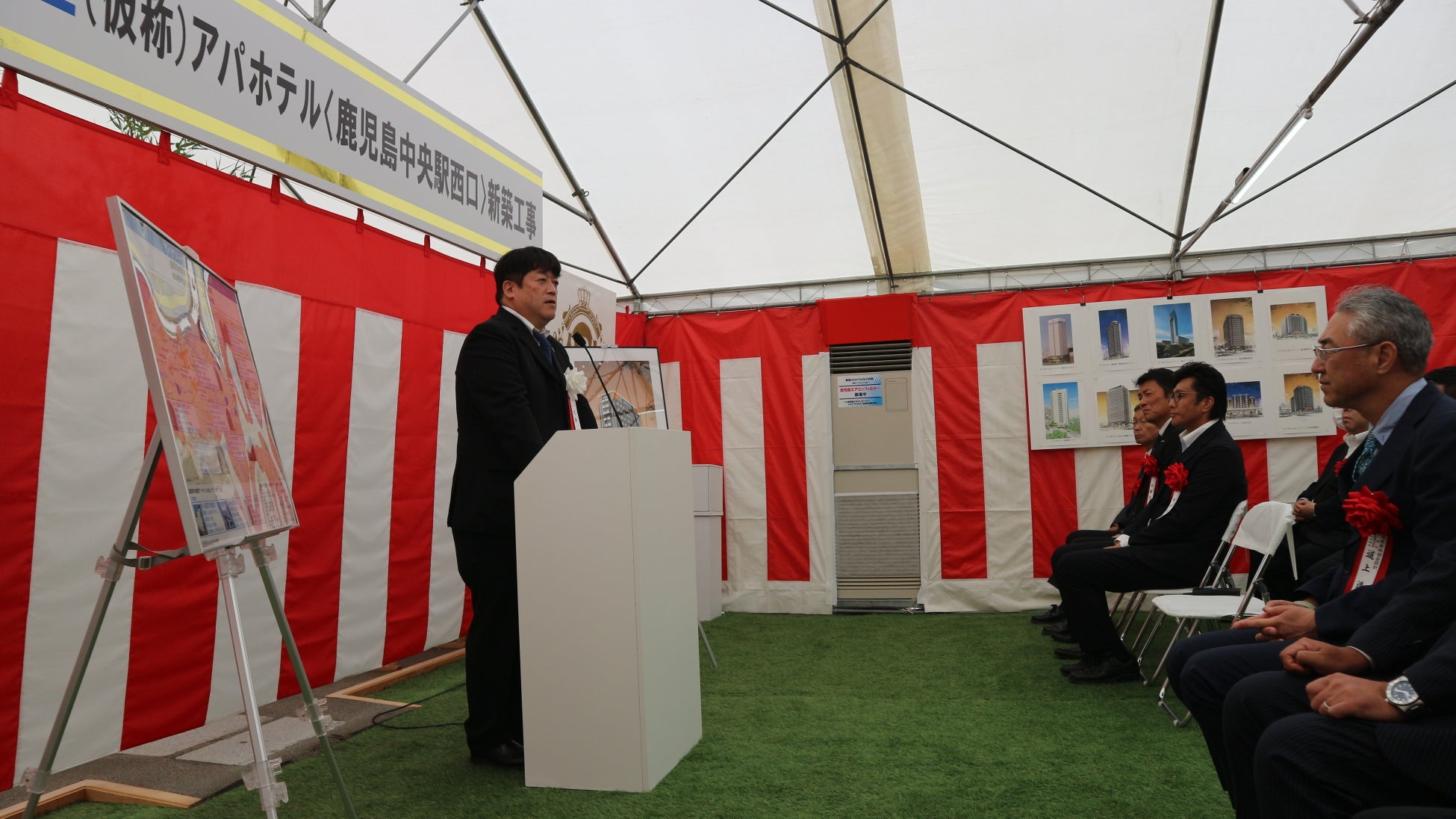 起工式において、アパグループ専務 元谷 拓は、「アパホテルはサッカー日本代表のスポンサーにもなり、日本代表と共に熱く戦っている。アパホテルはシティーホテルやリゾートホテル、旅館やビジネスホテルの良いところを集約し、先進的で高品質・高機能・環境対応型をブランドコンセプトにした「新都市型ホテル」を展開し、ビジネスやインバウンド、修学旅行、冠婚葬祭や地域コミュニティー需要など全方位で宿泊をして頂ける。観光大国日本の為に受け皿として、コロナ禍においても計画や工事を止めることなく進めてきた。鹿児島県では直営ホテル2棟目となるが、フランチャイズのアパホテル〈鹿児島国分〉や〈鹿児島天文館〉と共に連携して、鹿児島県の宿泊需要の創出に寄与して行きたい。鹿児島県はとても魅力のある県である為、経済発展の受け皿となるホテルを皆で作り、完成した暁には多くのお客様に感動を与えられるよう、また地域に愛されるホテル作りを目指し進化して行きたい。」と述べた。