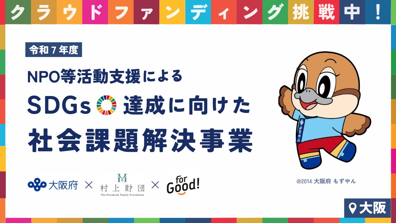 株式会社ボーダレス・ジャパン(本社:福岡県福岡市、代表取締役:田口一成)が運営するクラウドファンディングプラットフォーム「For Good」は、大阪府および一般財団法人村上財団と連携し、令和7年度「NPO等活動支援による社会課題解決事業」に参画しました。