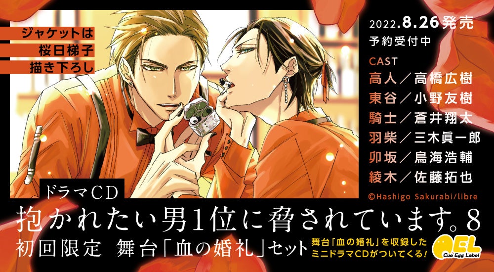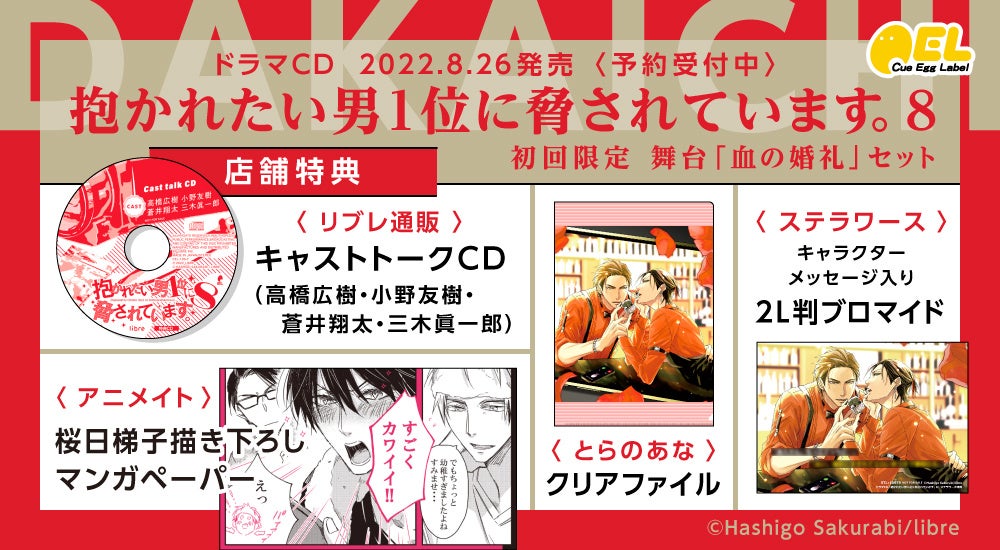 株式会社リブレ(本社:東京都新宿区、代表取締役社長:太田歳子)は、ドラマCD「抱かれたい男1位に脅されています。8」をCue Egg Labelより明日8月26日に発売いたします。https://www.b-boy.jp/special/dakaretai_1st/cd/