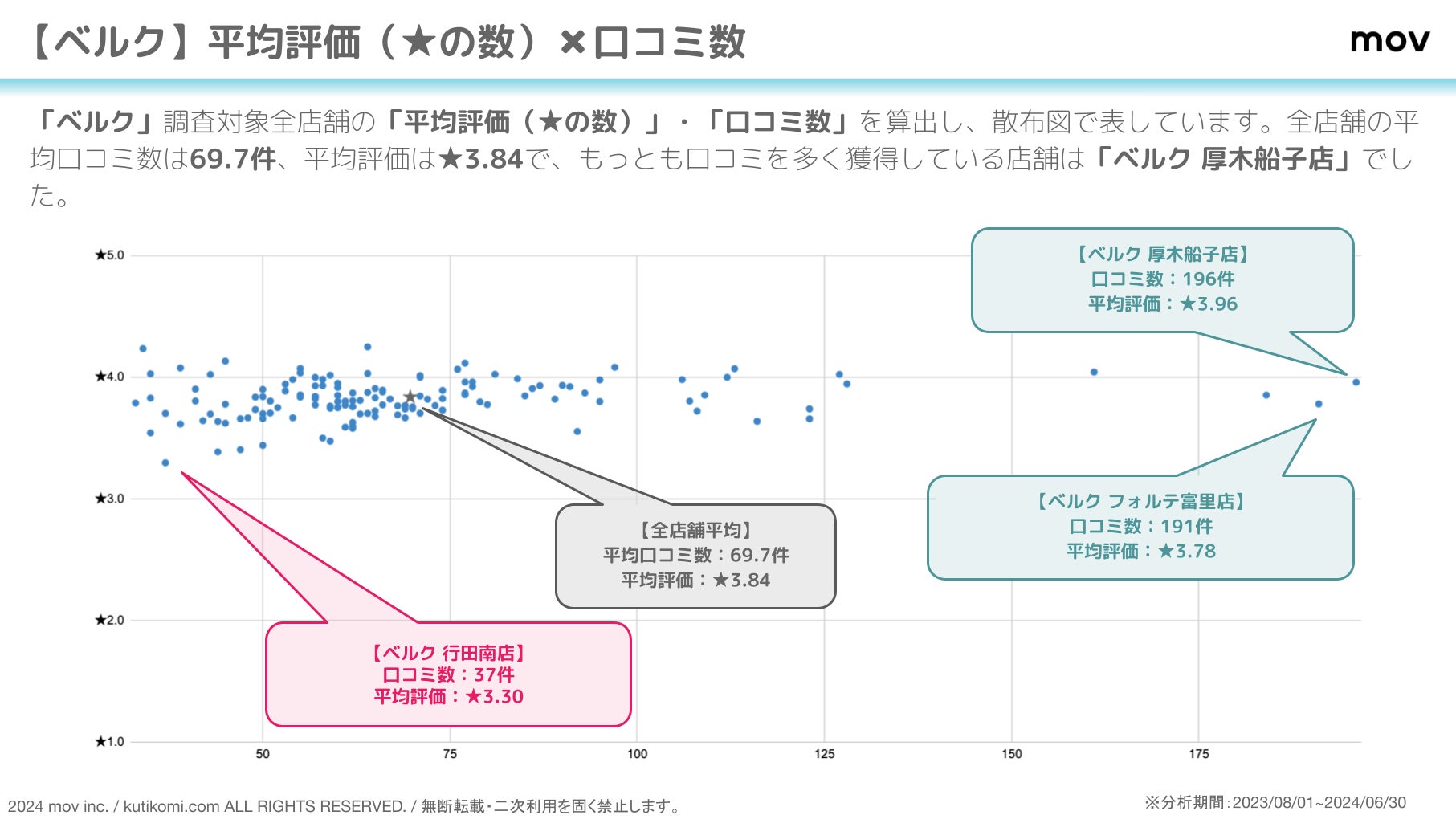 「ベルク」調査対象全店舗の「平均評価(★の数)」・「口コミ数」を算出し、散布図で表しています。全店舗の平均口コミ数は69.7件、平均評価は★3.84で、もっとも口コミを多く獲得している店舗は「ベルク 厚木船子店」でした。
