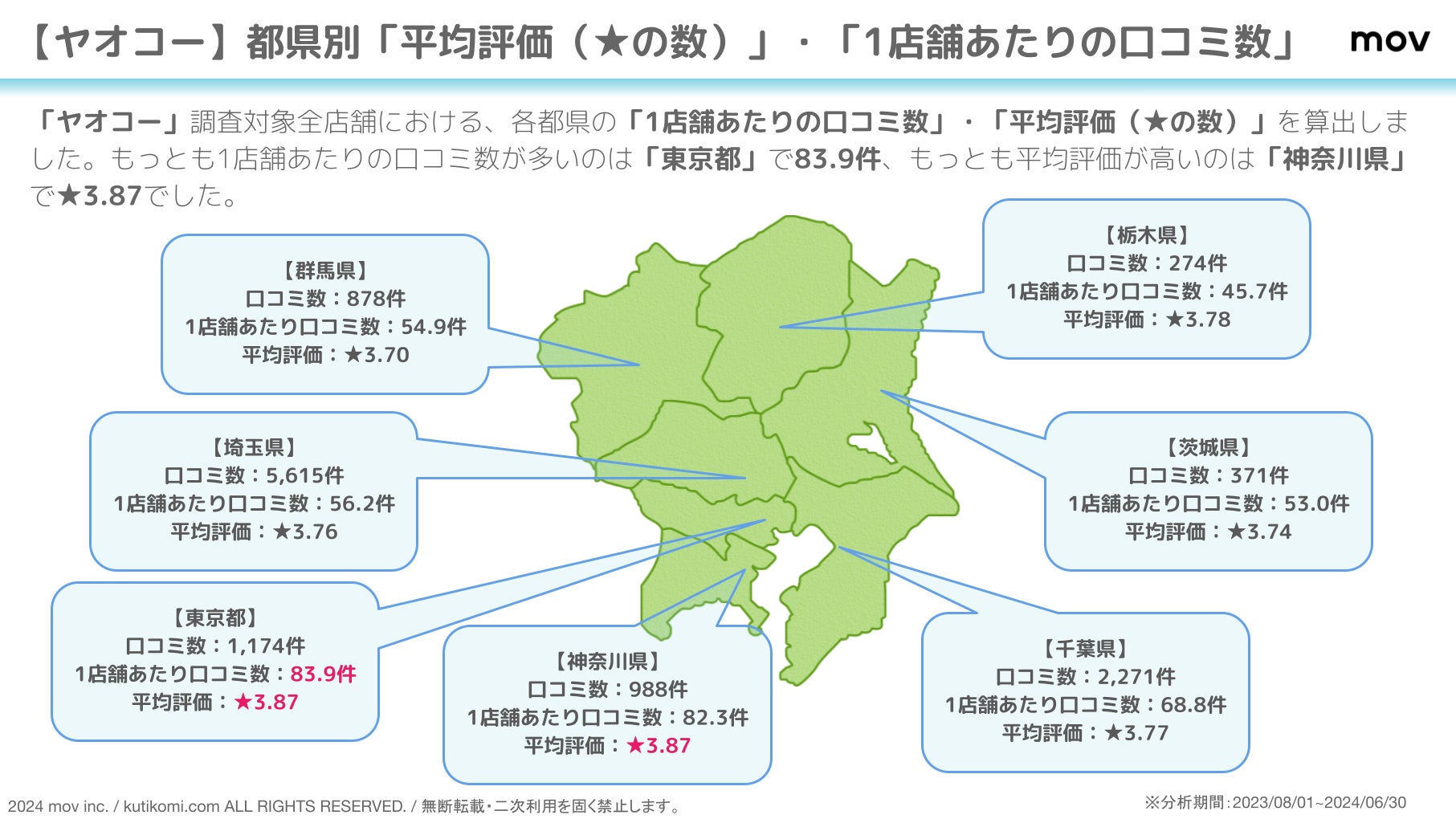 ■ 【ヤオコー】もっとも1店舗あたりの口コミ数が多いのは「東京都」、もっとも平均評価が高いのは「東京都」「神奈川県」