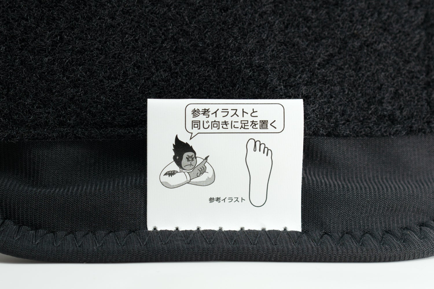 手軽にどなたでも使っていただけるように、面ファスナー仕様となっています。足に巻くだけで簡単に装着ができます。また、内側の取付位置の目安タグには、ゴリラのイラストが描かれています。