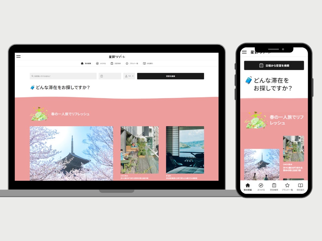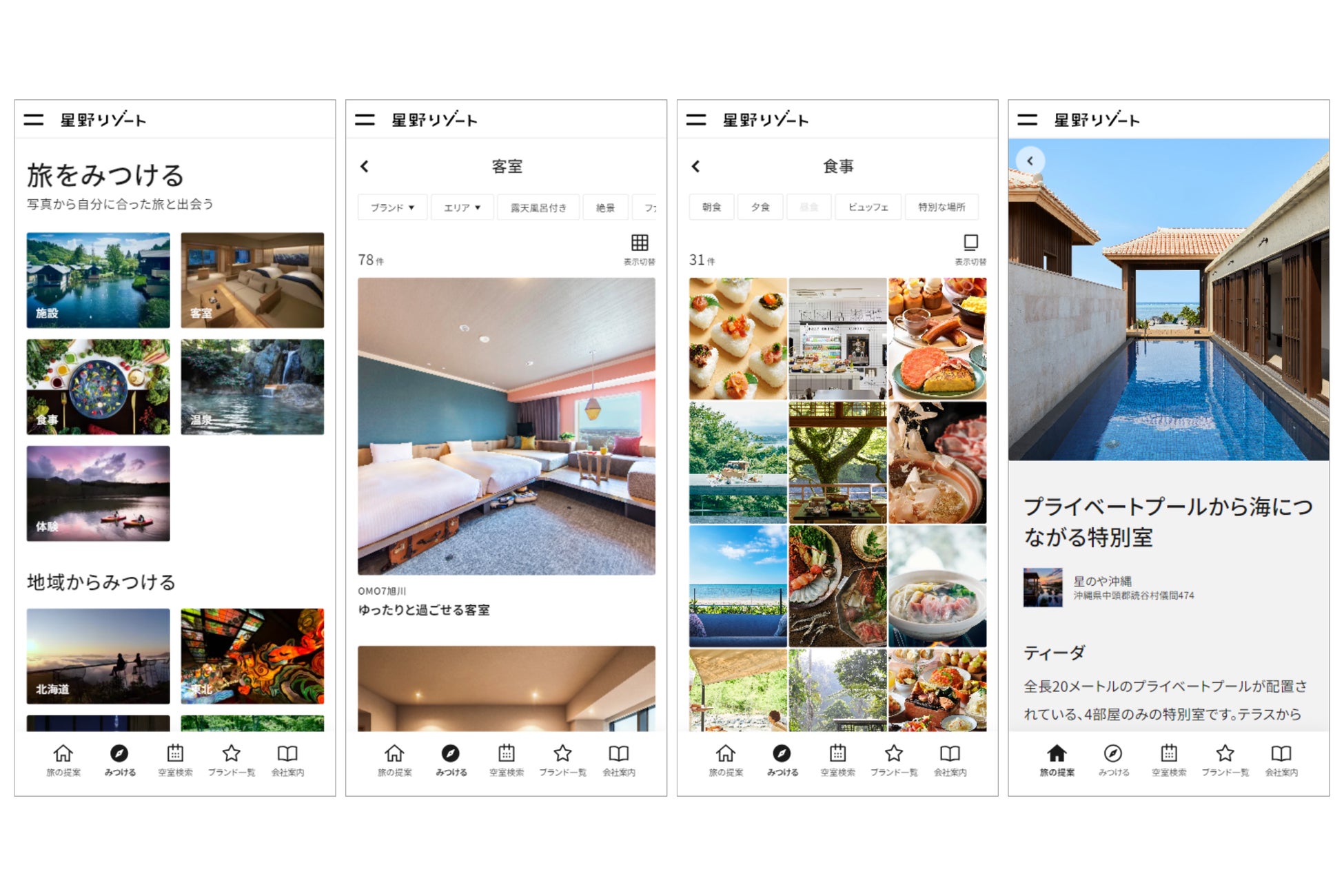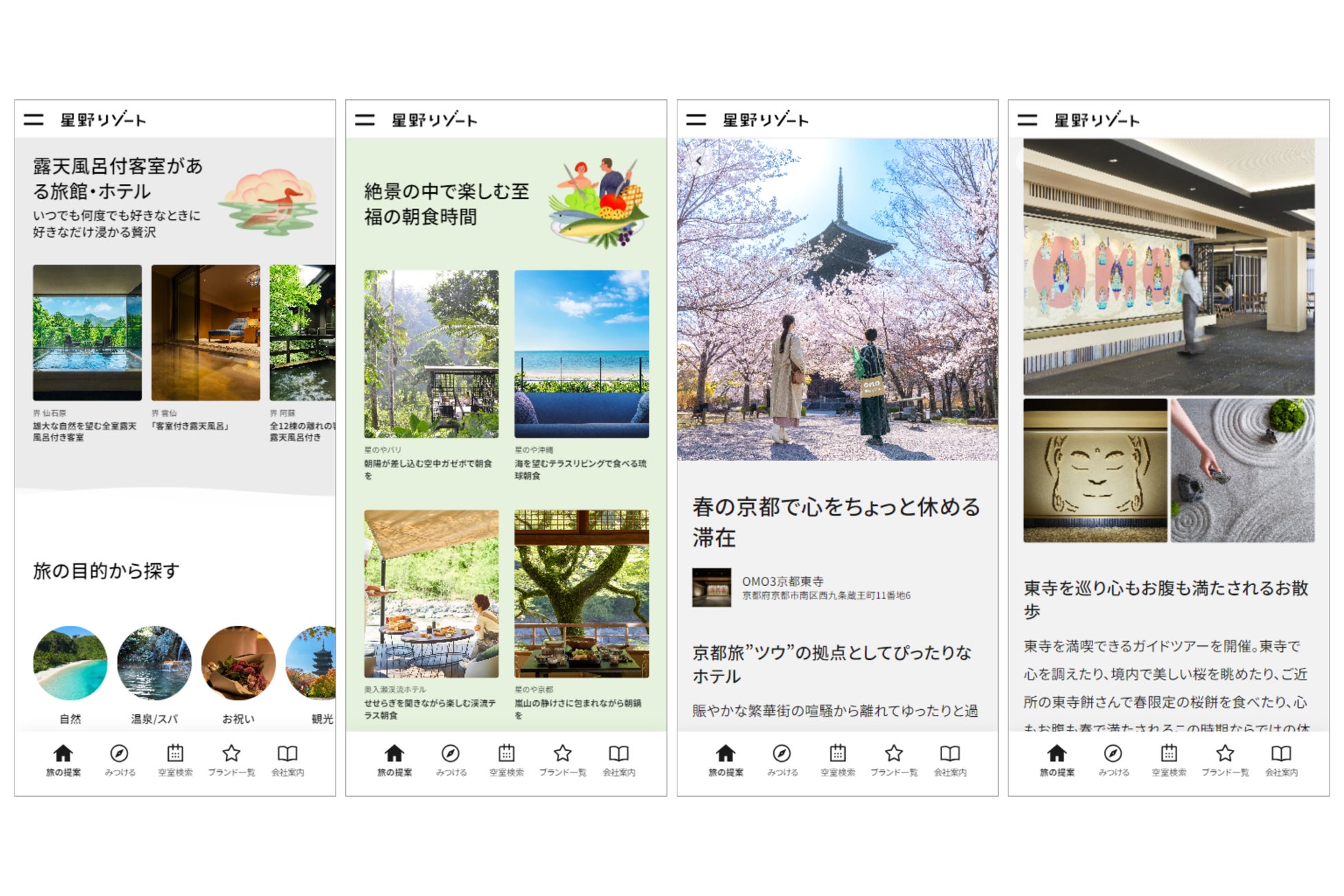 旅のニーズに合わせたテーマでおすすめ施設をまとめたコンテンツを掲載したトップページや、写真から星野リゾートの全施設を横断して施設や客室、温泉、食事、体験を検索・発見できるコンテンツ「旅をみつける」を新たに追加しました。旅のニーズが多様化する中で、様々な切り口から自分に合った楽しい旅に出合えるコンテンツを盛り込みました。