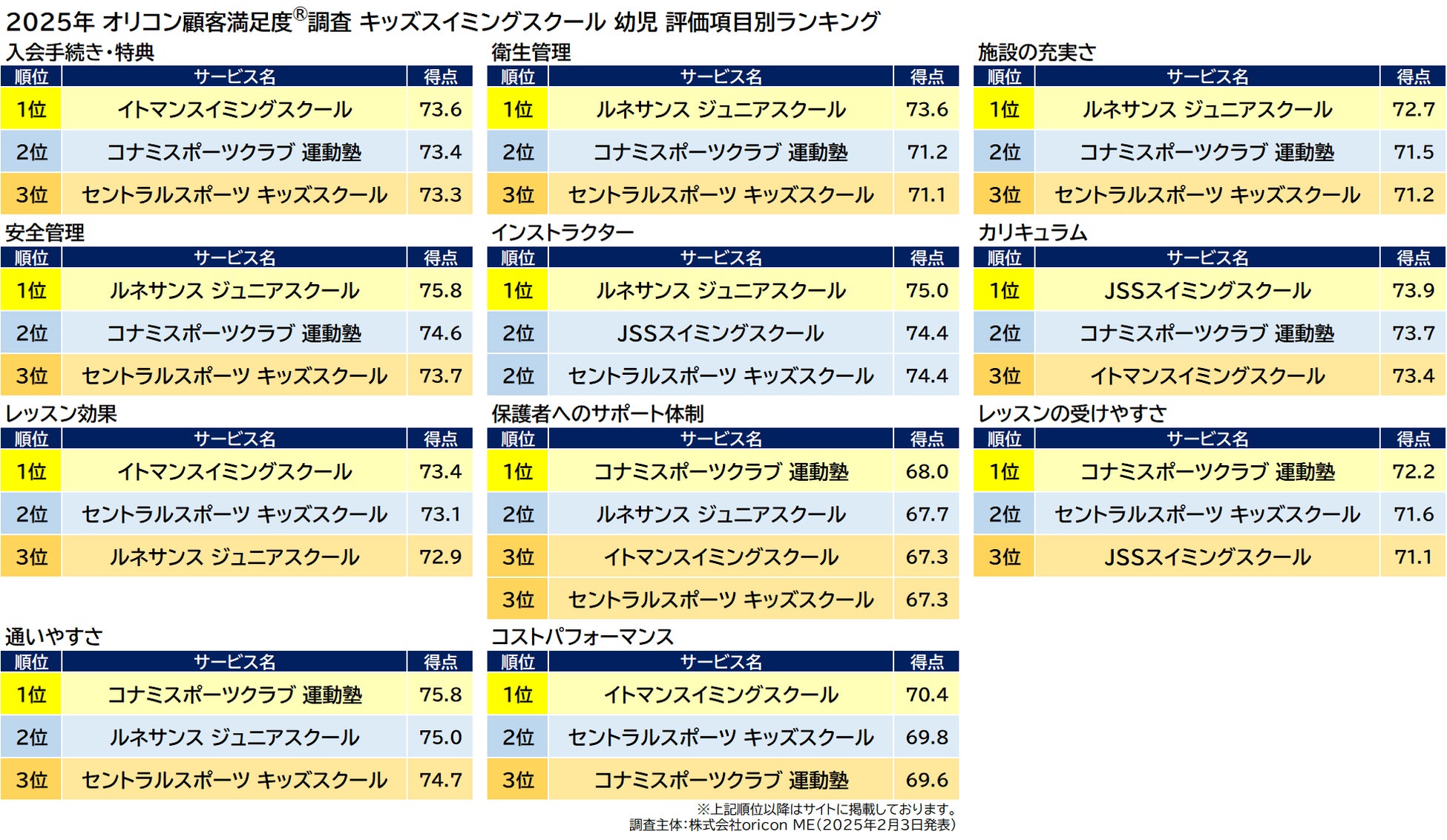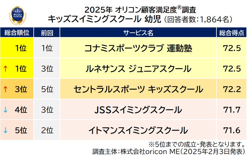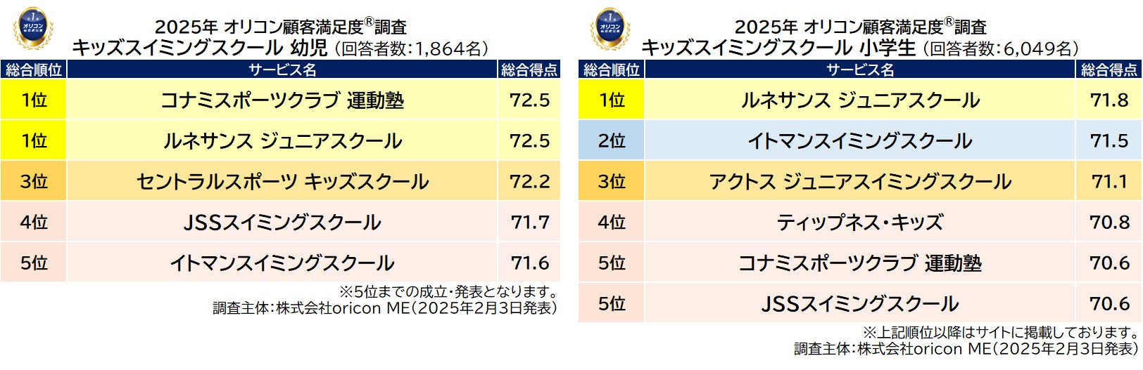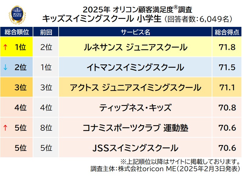 実際のサービス利用者を対象に第三者の⽴場で顧客満⾜度調査を実施する株式会社oricon ME(本社:東京都港区 代表取締役社⻑:⼩池 恒 略称:オリコン)は『キッズスイミングスクール』についての満⾜度調査を実施し、2025年2⽉3日(月)14時にその結果を「オリコン顧客満⾜度® 」公式サイト内( https://life.oricon.co.jp/ )にて発表いたしました。結果は以下の通りとなりました。
