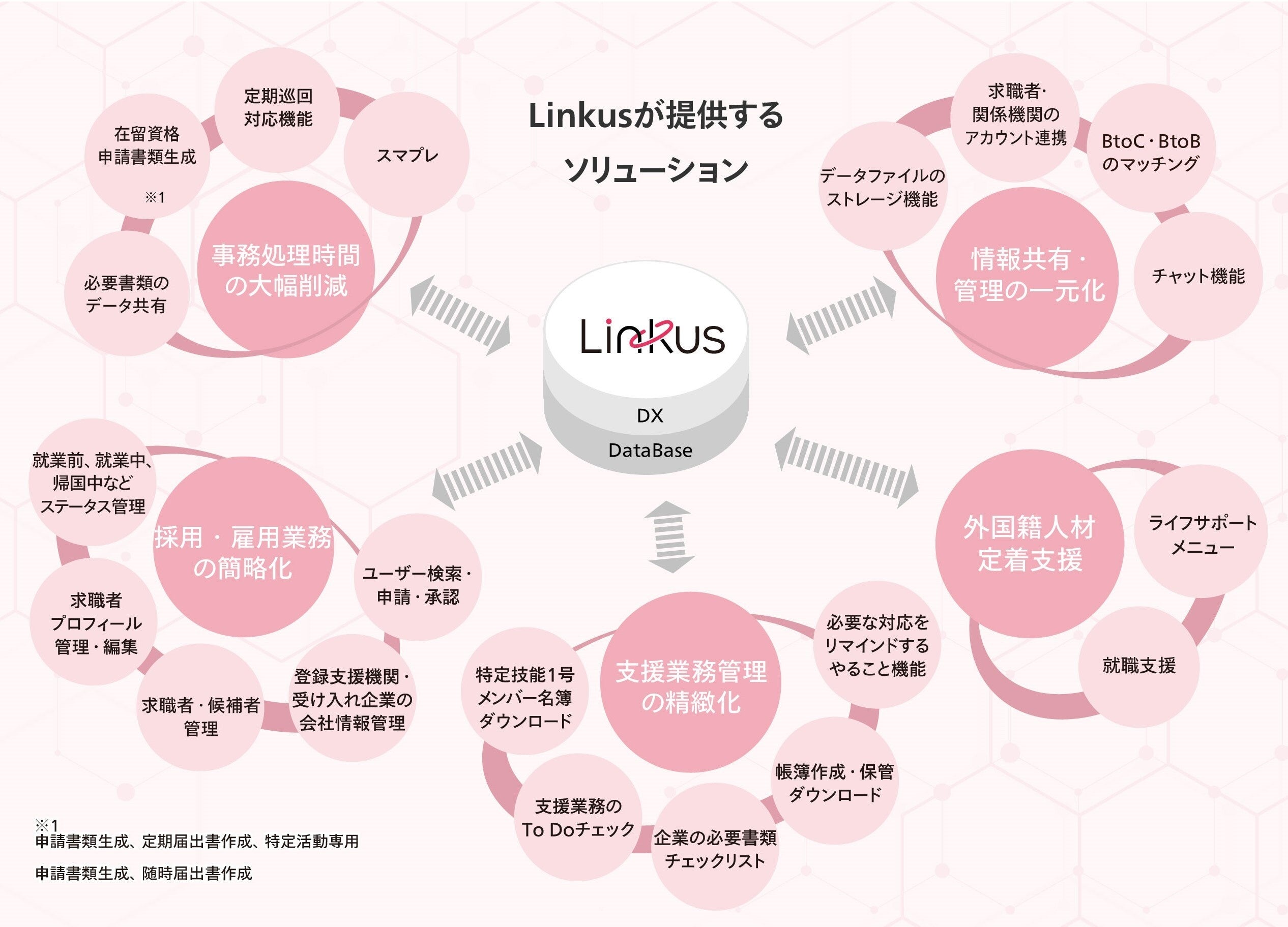 Linkusは、特定技能の雇用・支援に伴って発生する多岐にわたる煩雑な業務をITの力で簡略化することで、関係企業・団体が特定技能外国人の支援に集中できる環境を構築し、制度の健全運用に貢献することを目指し、2020年7月よりサービスを開始しました。